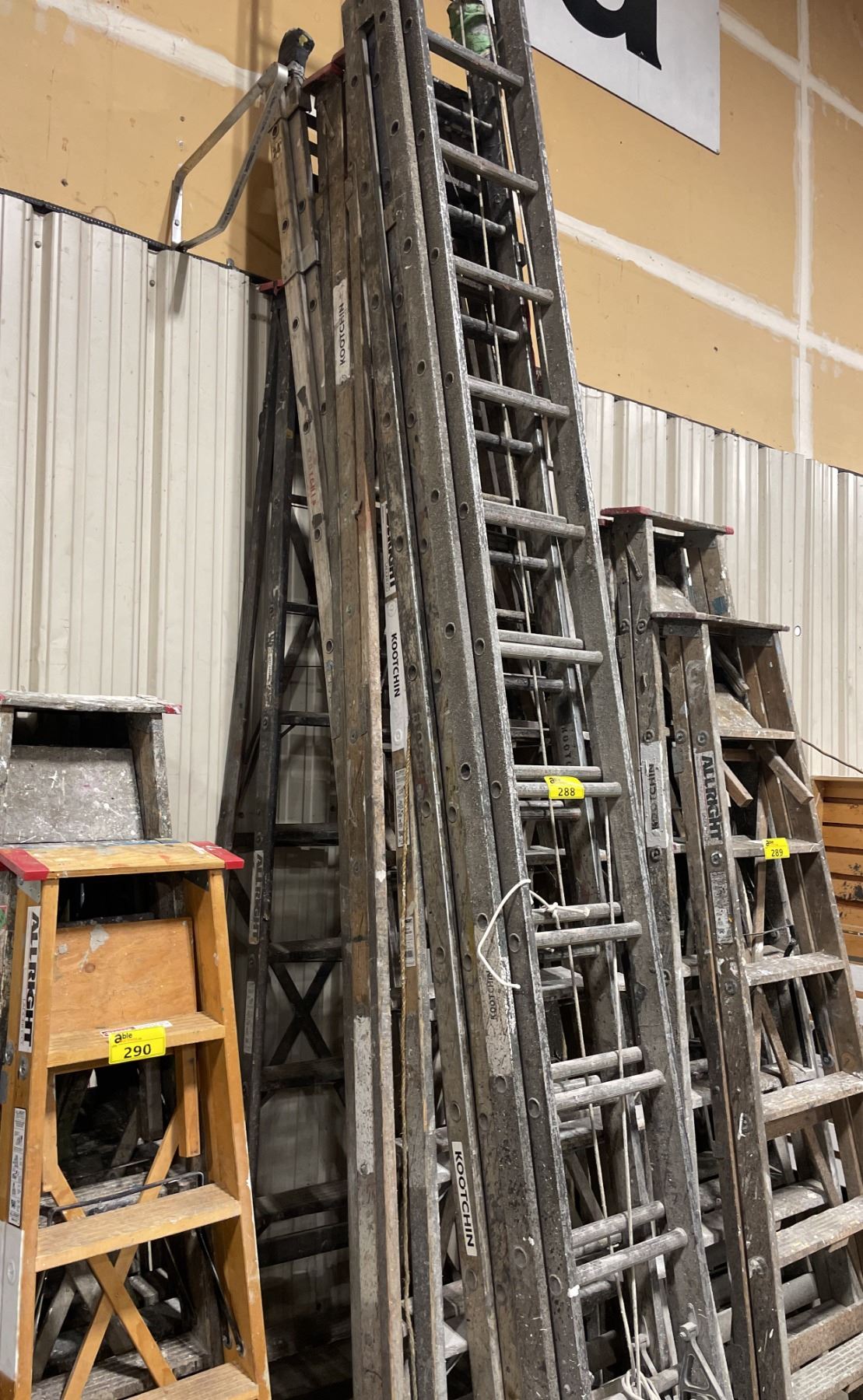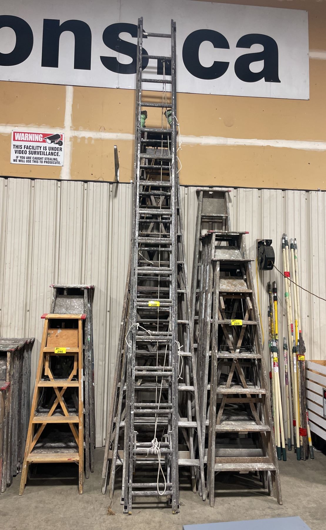 STACK OF ASSORTED COMMERCIAL ALUMINUM EXTENSION LADDERS & LARGE WOODEN STEP LADDERS *MUST TAKE ALL*
