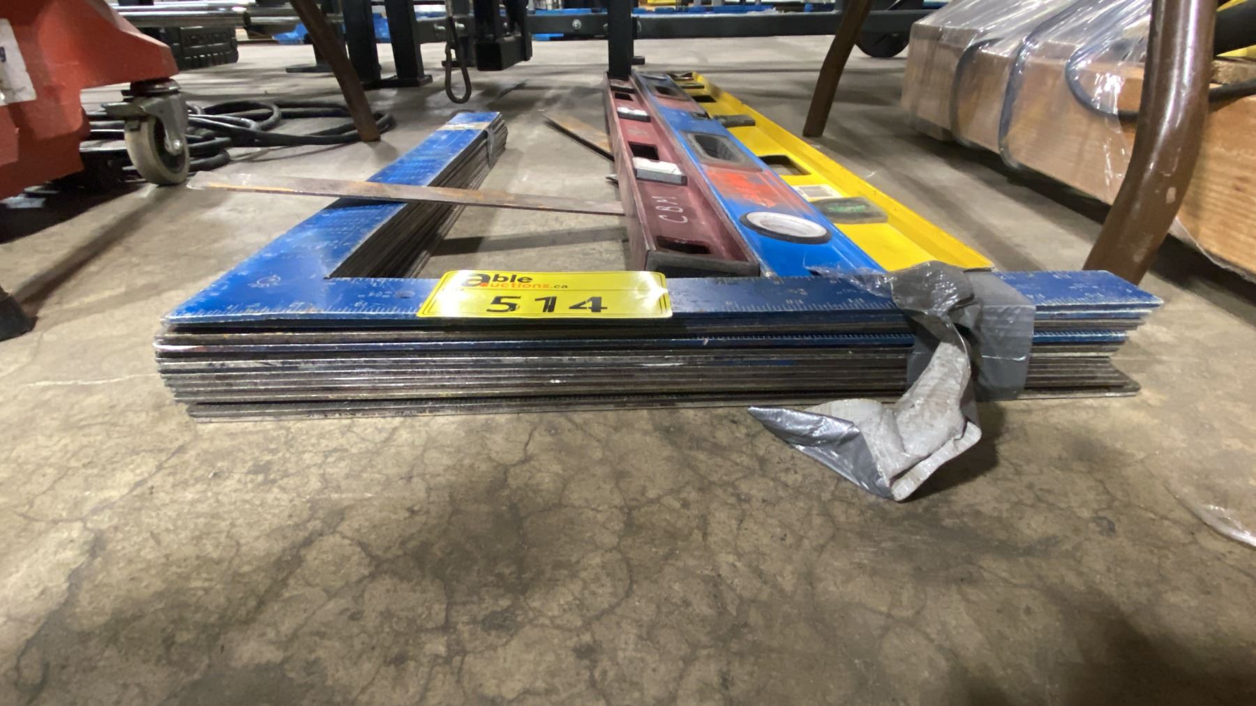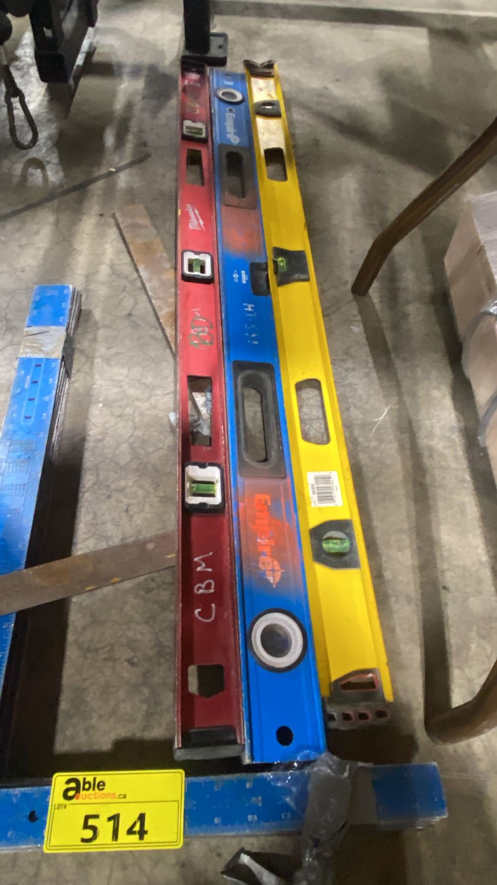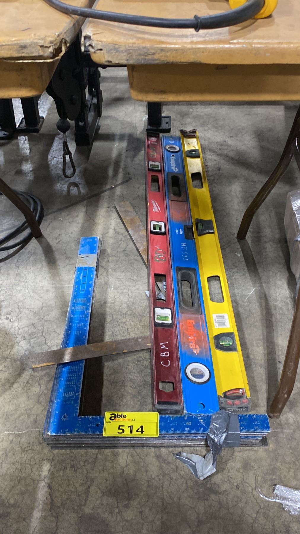 STACK OF ASSORTED FRAMING SQUARES & 3 INDUSTRIAL LEVELS