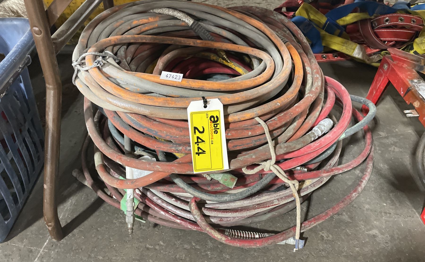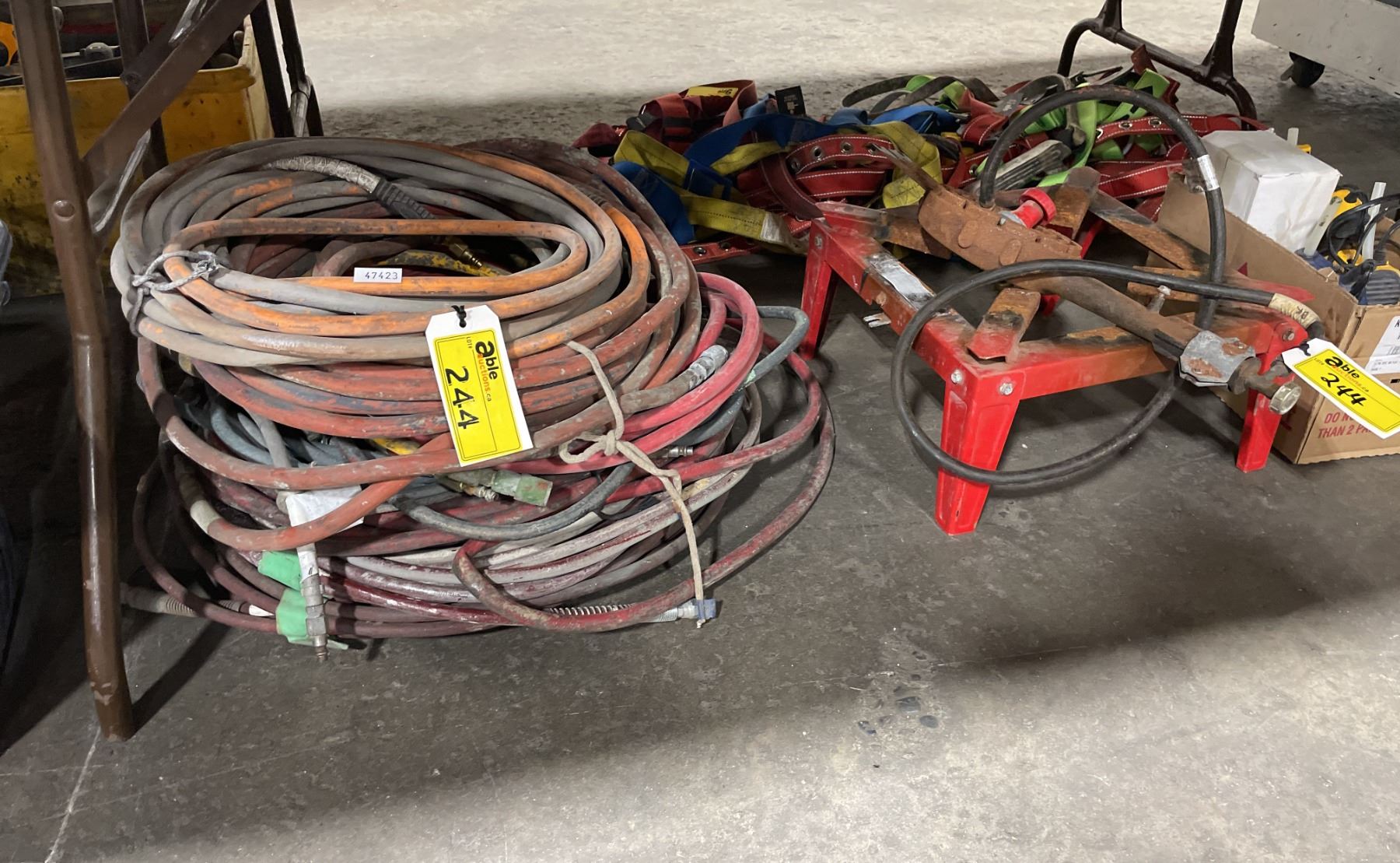 STACK OF ASSORTED INDUSTRIAL AIR HOSES & RED GAS STOCK POT BURNER