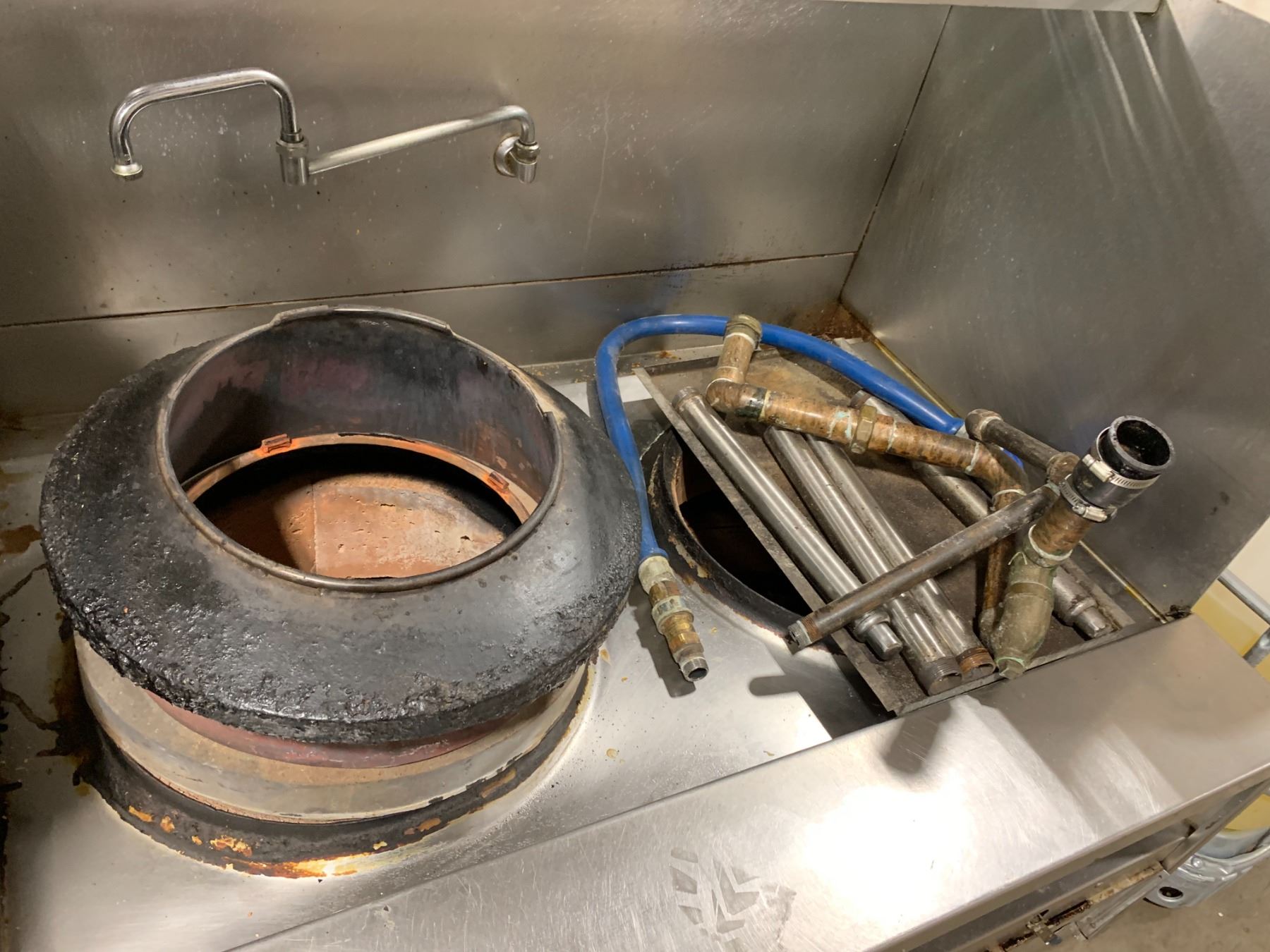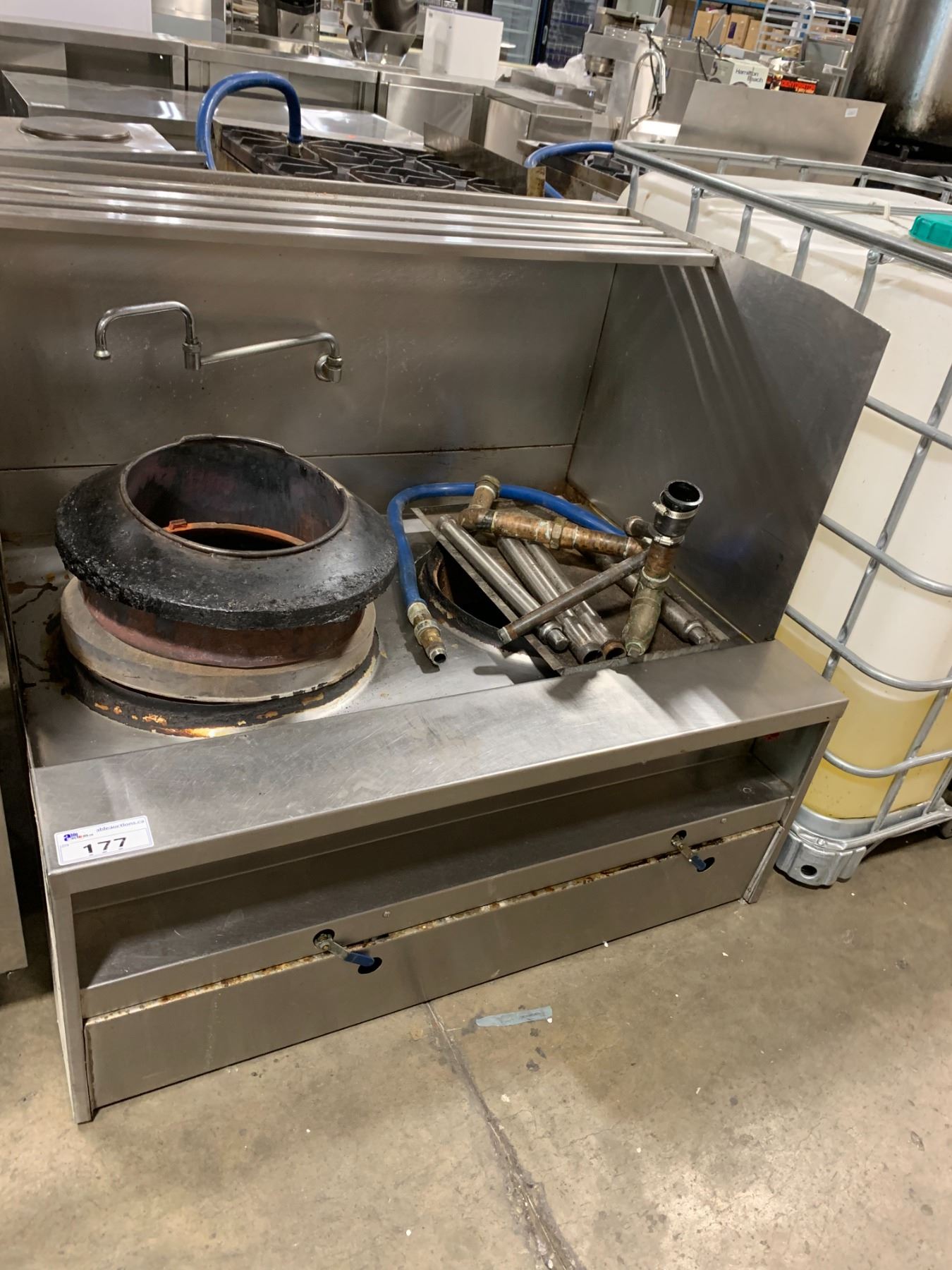 STAINLESS STEEL 2 STATION 48"W X 36"D COMMERCIAL WOK RANGE WITH LEGS & BACKSPLASH POT RACK