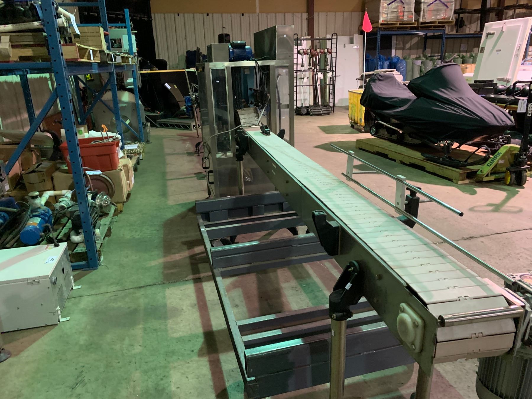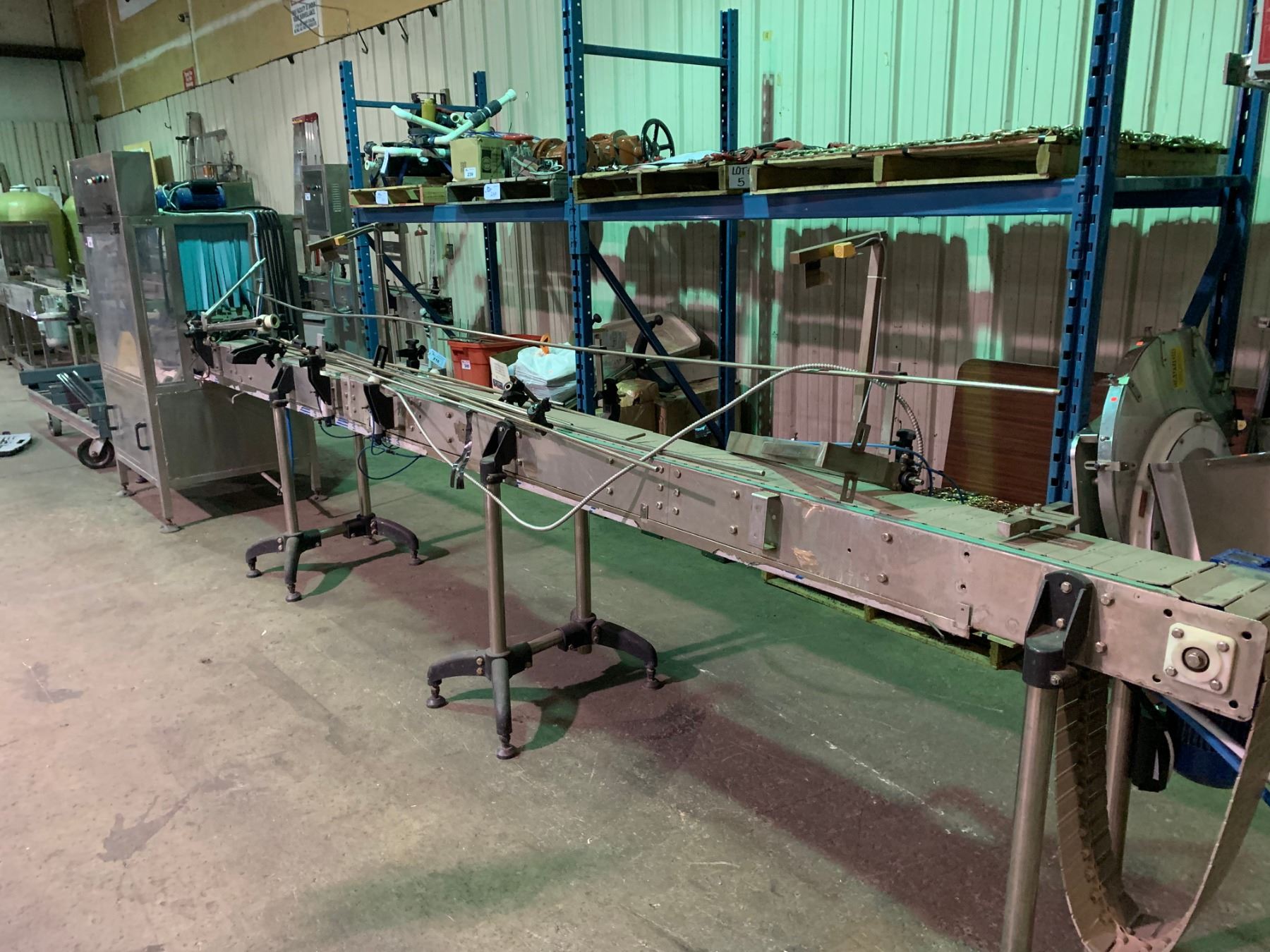 STAINLESS STEEL 250M ALKALINE BOTTLE WASHER WITH 15' POWERED STAINLESS STEEL CONVEYOR FEEDER, & 10' POWERED STAINLESS STEEL CONVEYOR SYSTEM