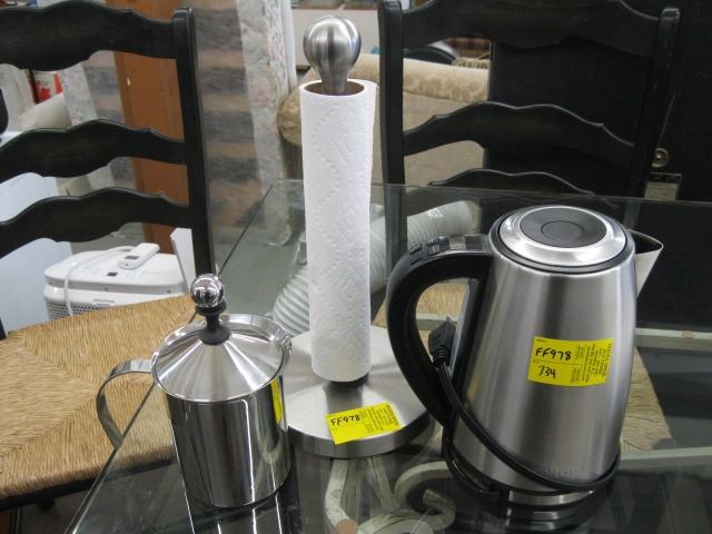 STAINLESS STEEL KETTLE, PAPER TOWEL HOLDER & STRAINER POT