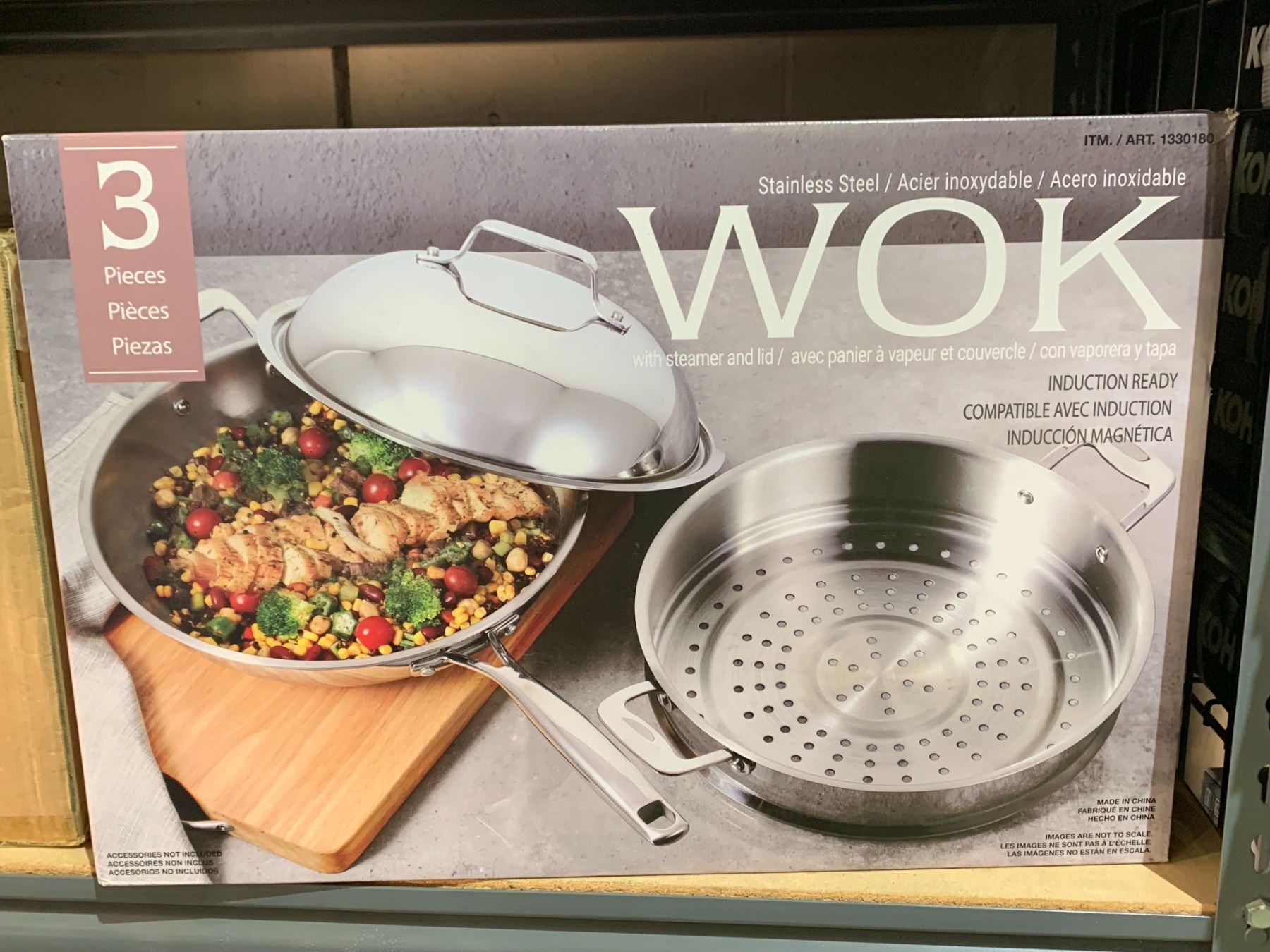 STAINLESS STEEL WOK WITH STEAMER AND LID