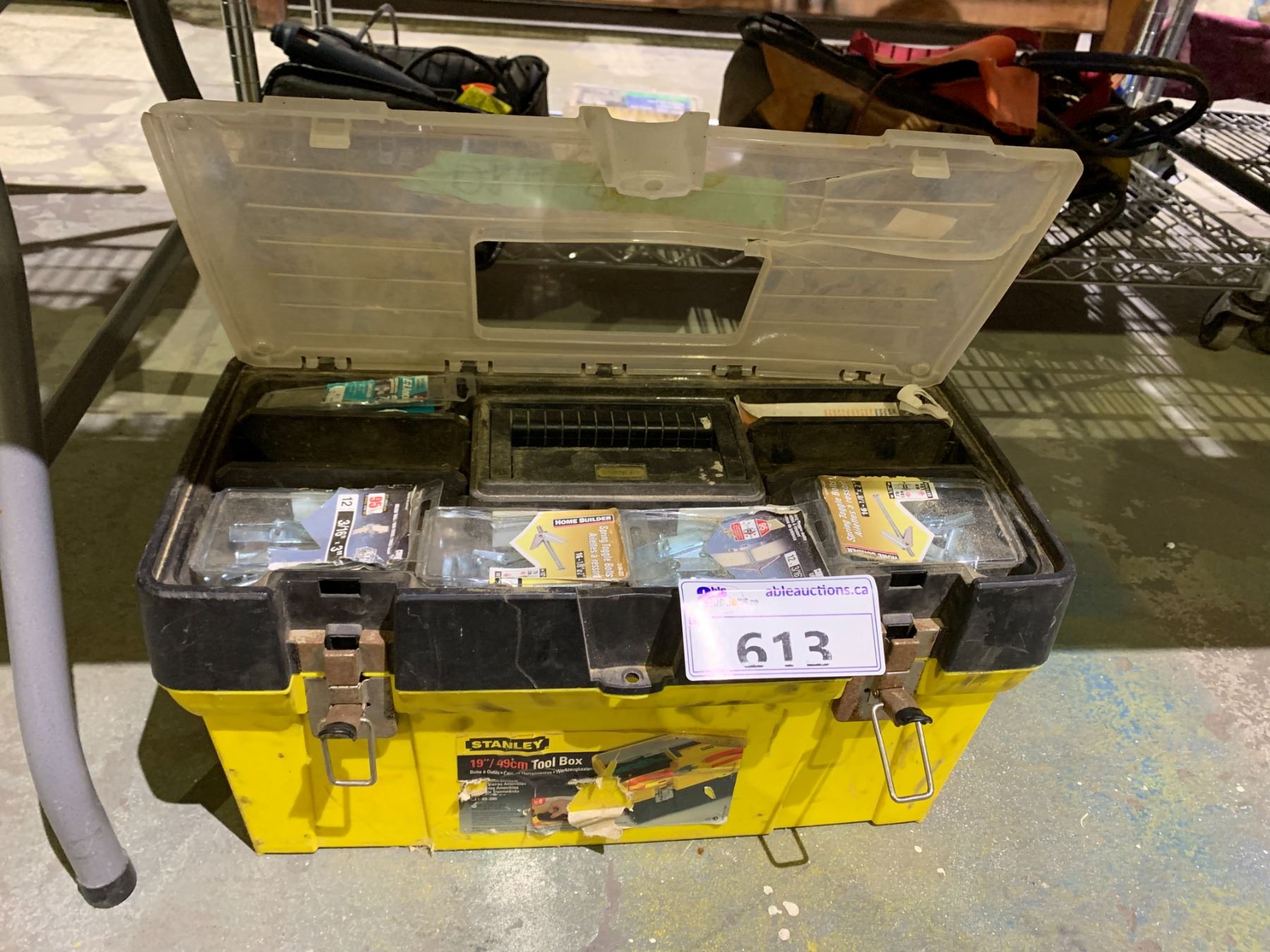 STANLEY 19" TOOLBOX WITH ASSORTED CONTENTS INCLUDING; HARDWARE, DRILL BITS, RECIPROCATING SAW BLADES & MORE