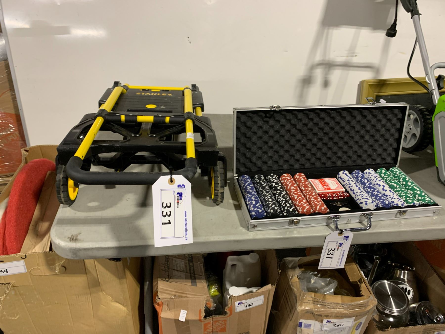 STANLEY BLACK 2 IN 1 FOLDING UTILITY HAND TRUCK & CHIP DICE STYLE POKER SET IN  ALUMINUM HARD CASE