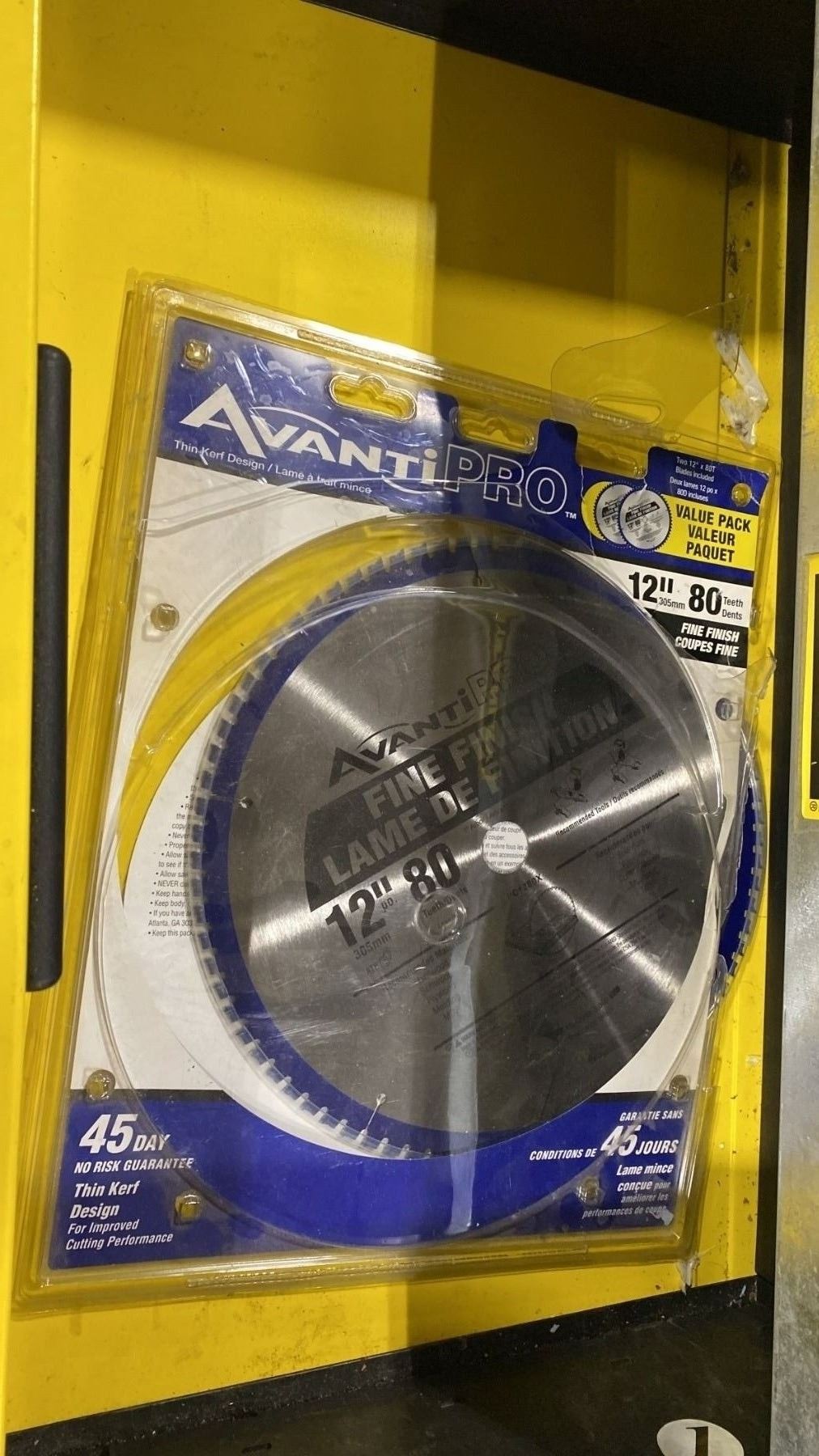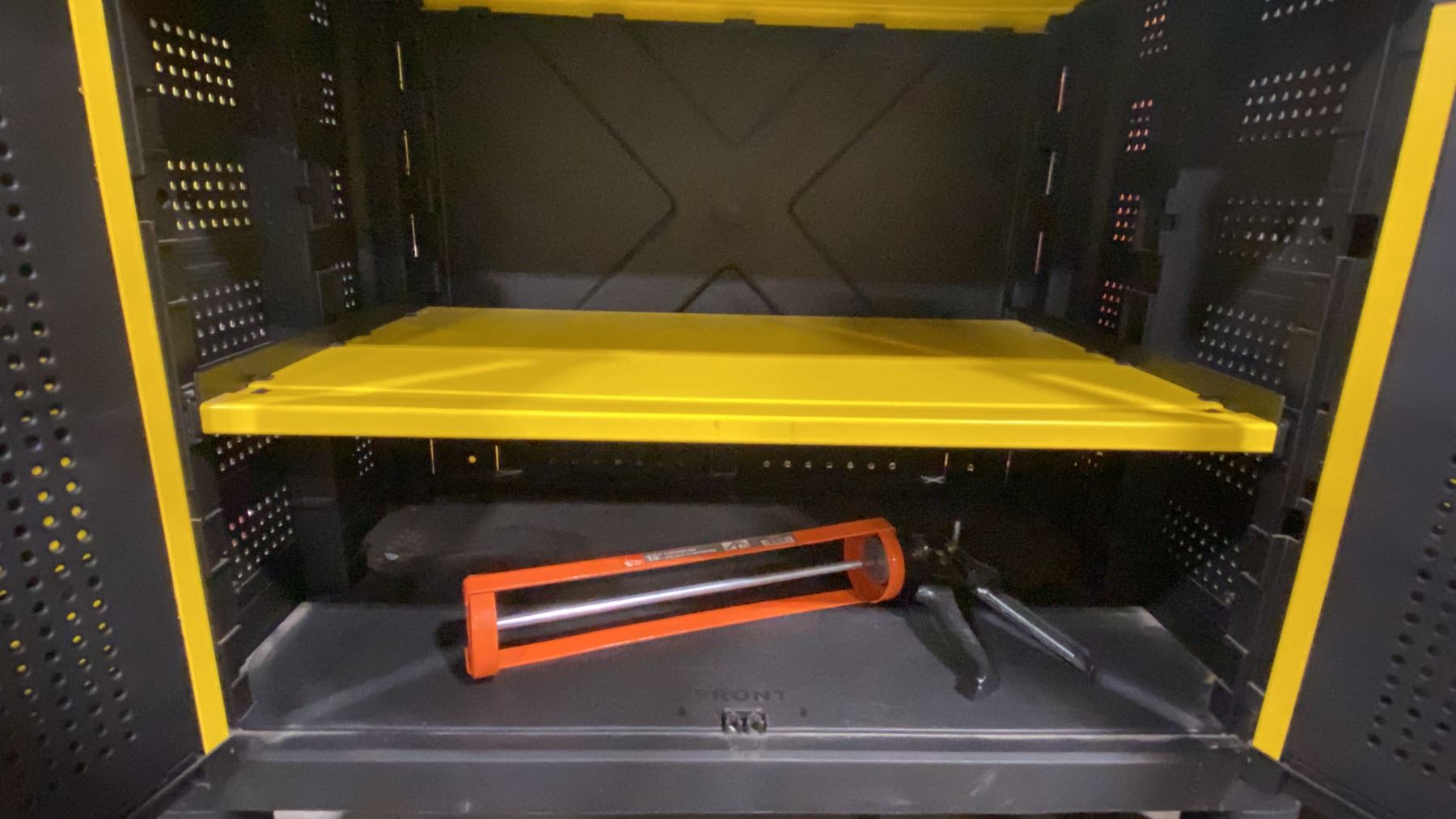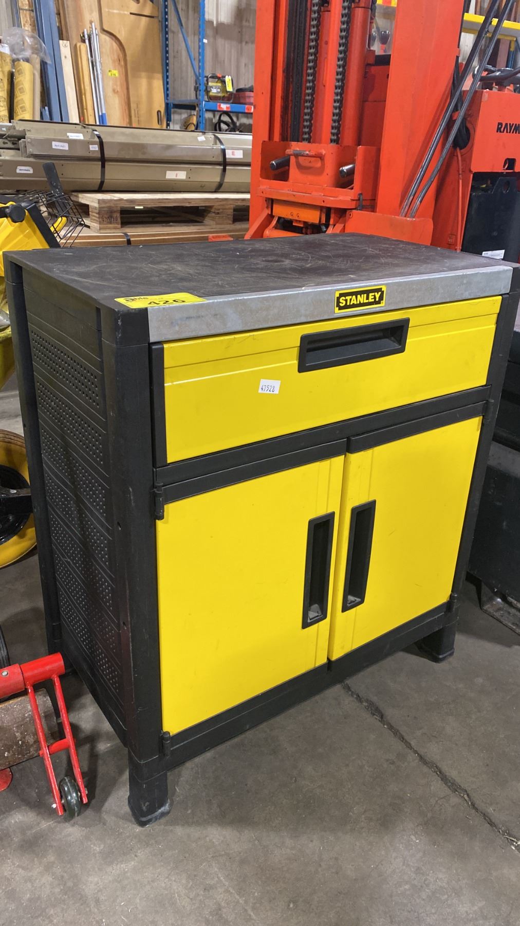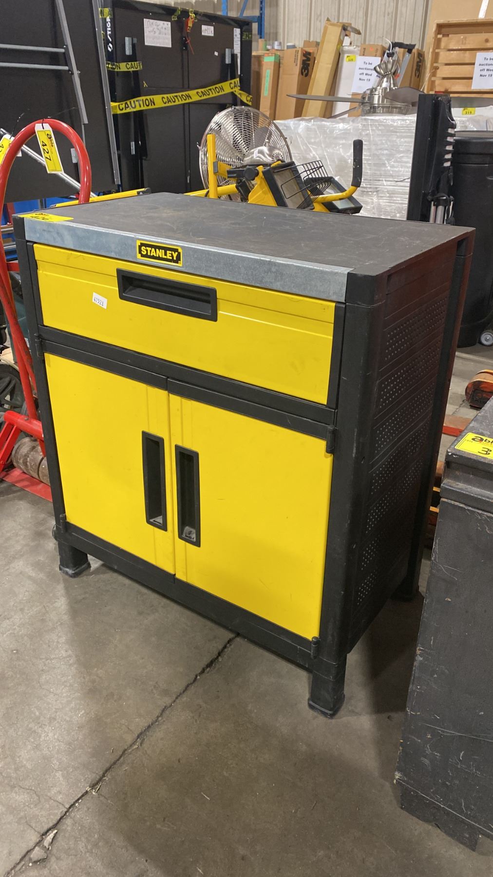 STANLEY YELLOW/BLACK TOOL STORAGE BOX APPROX 30"W X 18"D X 34"H *CONTENTS INCLUDED - 12" AVANTIPRO SAW BLADE & CAULKING GUN*