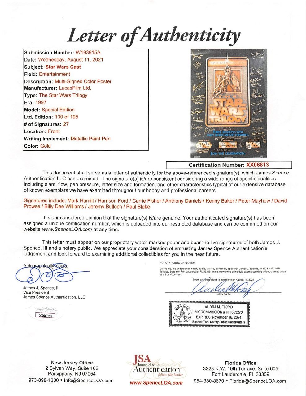 This Autographed Limited Edition #130/195 24x38 Star Wars Trilogy Poster has been Personally Signed by Mark Hamill, Harrison Ford, Carrie Fisher, Anthony Daniels, Kenny Baker, Peter Mayhew, David Prowse, Billy Dee Williams, Jeremy Bulloch, Paul Blake & 17 more of Star Wars. This item is 100% Authentic to include a Certificate of Authenticity (COA) / hologram by JSA.