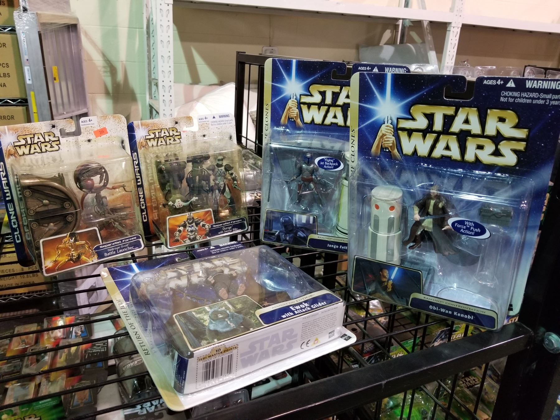 STAR WARS CLONE WARS DESTROYER DROID BATTLE LAUNCHER, DURGE WITH SWOOP BIKE, STAR WARS ATTACK OF THE CLONES JANGO FETT & OBI-WAN KENOBI, STAR WARS RETURN OF THE JEDI EWOK WITH ATTACK GLIDER