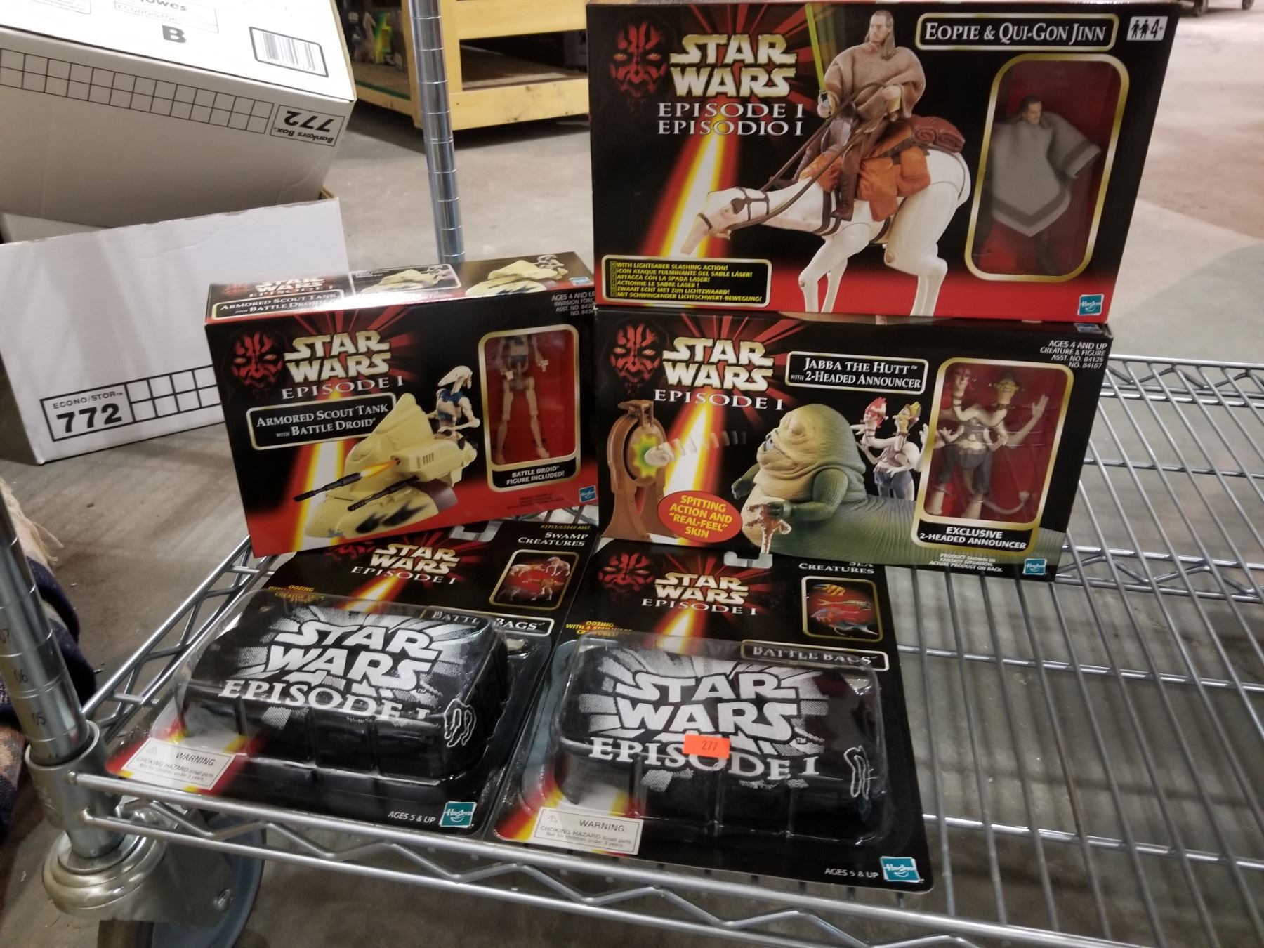STAR WARS EPISODE I JABBA THE HUTT WITH 2-HEADED ANNOUNCER, EOPIE & QUI-GON JINN, ARMORED SCOUT TANK WITH BATTLE DROID & STAR WARS EPISODE I BATTLE BAGS