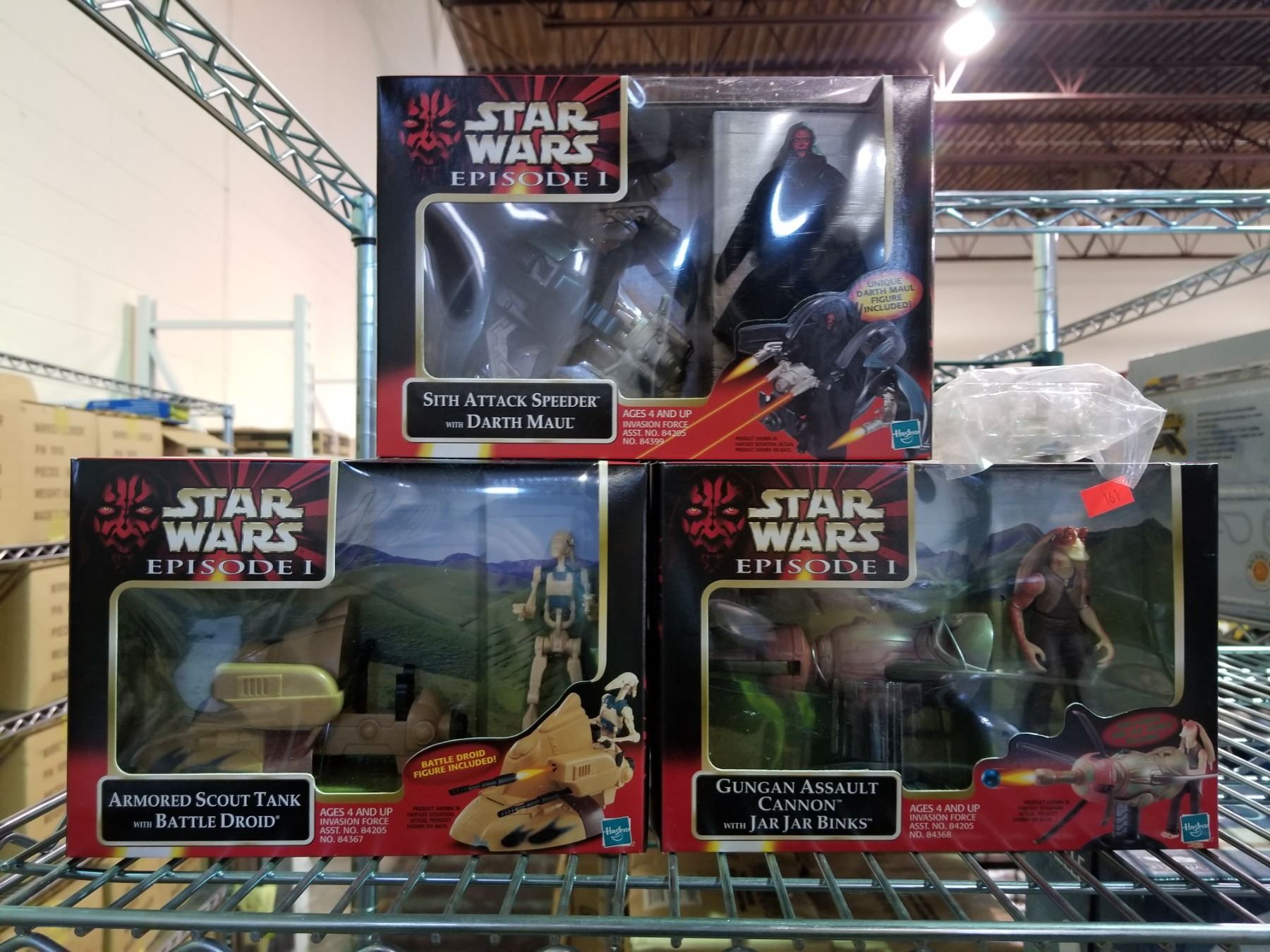 STAR WARS EPISODE I SITH ATTACK SPEEDER WITH DARTH MAUL, ARMORED SCOUT TANK WITH BATTLE DROID, GUNGAN ASSAULT CANNON WITH JAR JAR BINKS