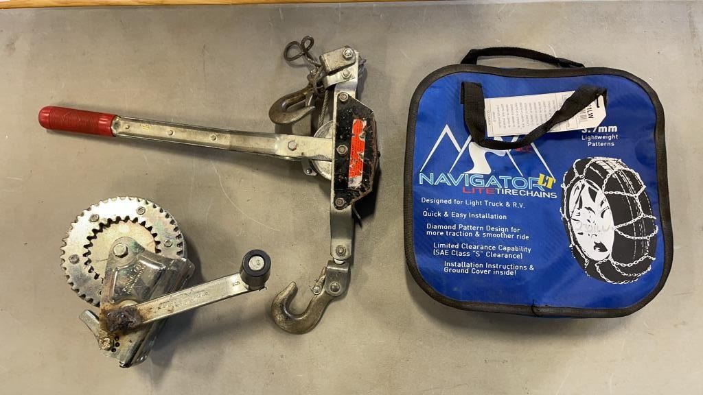 STEEL CABEL COME ALONG W/ MANUAL, WINCH, AND SET OF NEW NAVIGATOR TIRE CHAINS