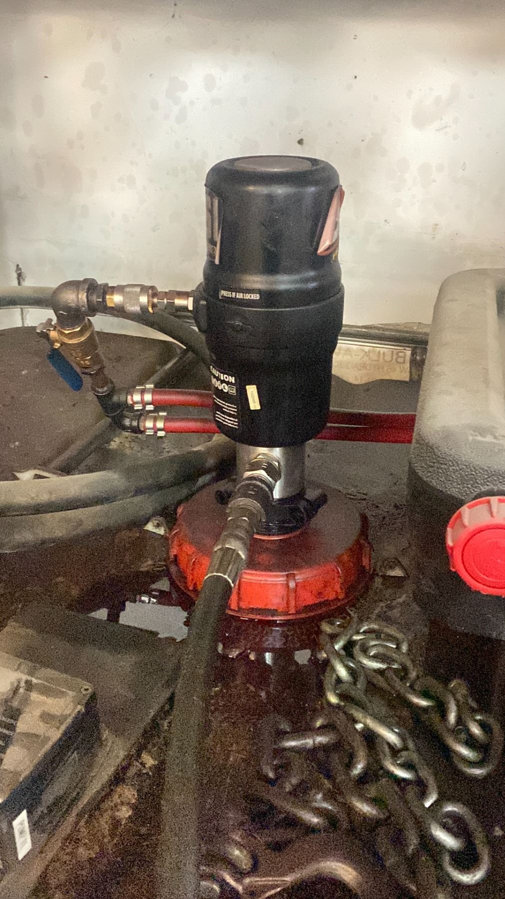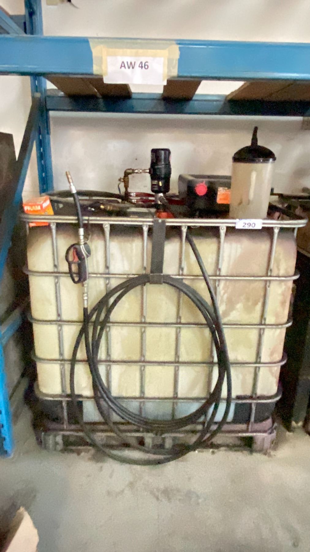 STEEL CAGED LIQUID STORAGE CONTAINER (SOME CONTENTS INSIDE) WITH PUMP, DISPENSING NOZZEL AND ASSORTED CONTAINERS