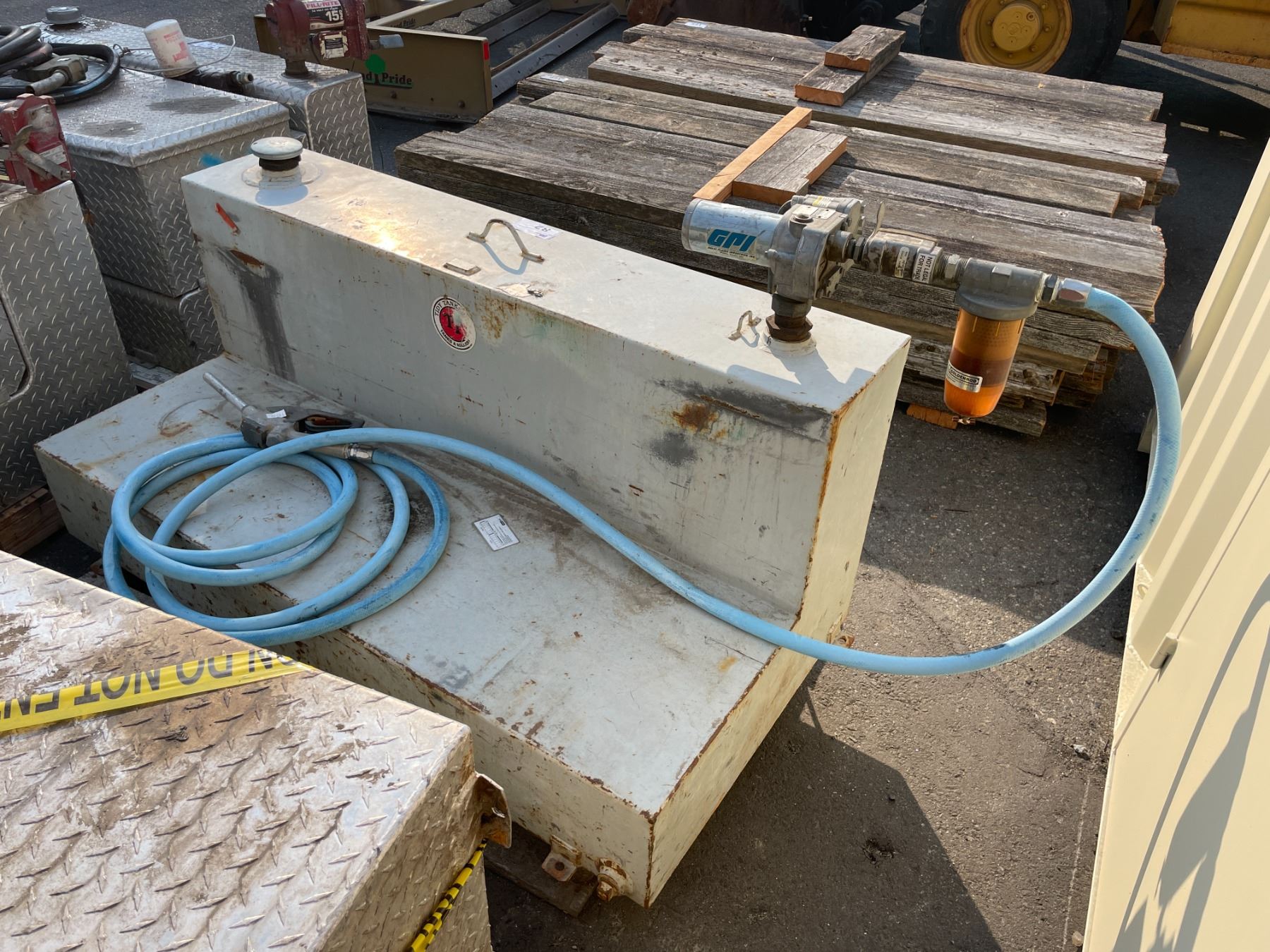 STEEL TIDY TANK 55"W X 29"D X 25"H L-SHAPED FUEL / TOOL STORAGE BOX WITH GPI FUEL PUMP, HOSE & NOZZLE