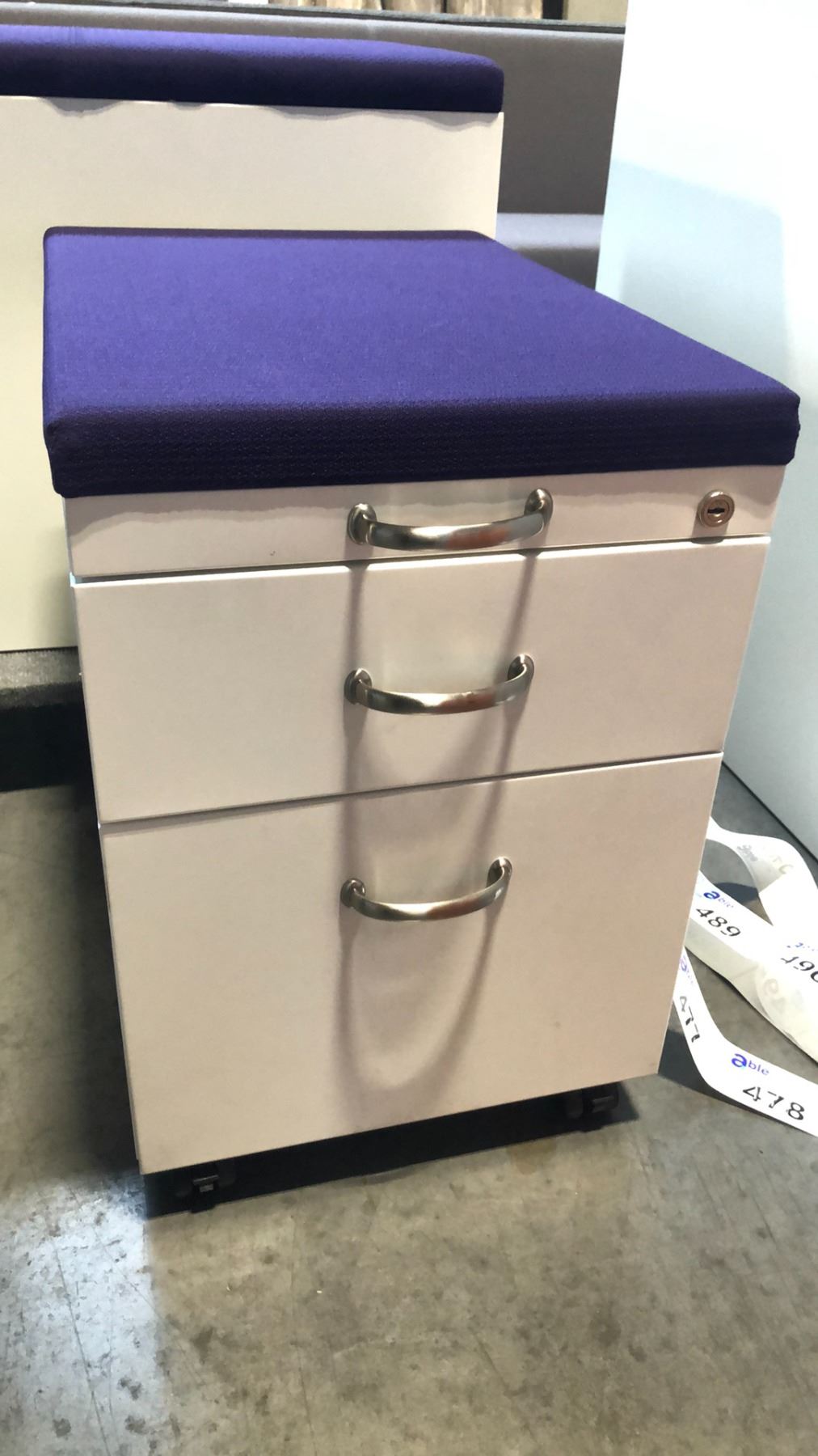 STEELCASE BEIGE 2 DRAWER PURPLE CUSHION TOP MOBILE PEDESTAL