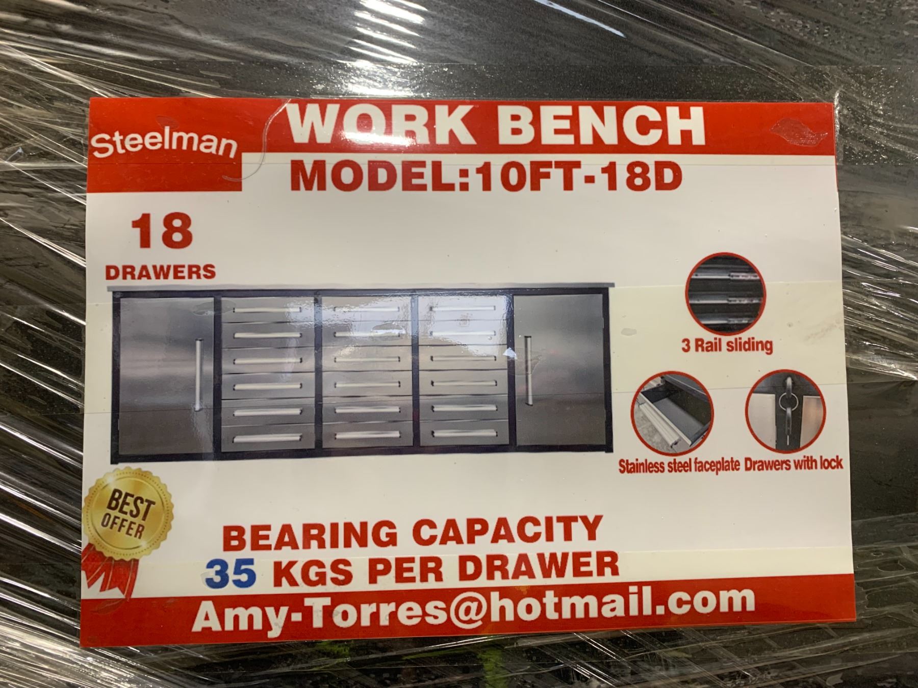 STEELMAN STAINLESS STEEL 18 DRAWER 2 DOOR WORKBENCH 36"H X 112"W X 22"D WITH ANTI-SLIP LINING, LOCKING DRAWERS, KEYS, 3 RAIL SLIDERS WITH 35KG CAPACITY PER DRAWER