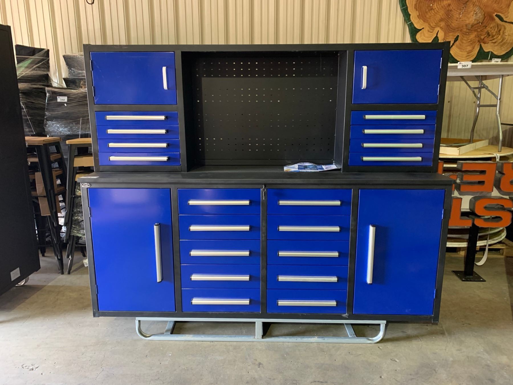 STEELMAN STAINLESS STEEL 18 DRAWER 4 DOOR WORKBENCH 67"H X 87"W X 23"D WITH ATTACHED HUTCH, ANTI-SLIP LINING DRAWERS, KEYS, THREE RAIL SLIDERS WITH 45 KG CAPACITY PER DRAWER, & BACK PEGBOARD SYSTEM