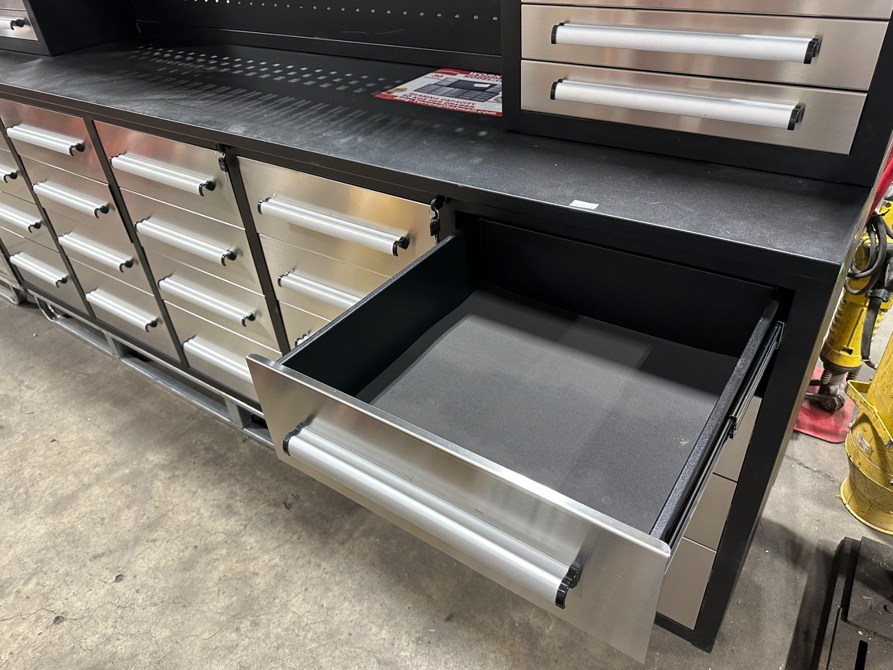 STEELMAN STAINLESS STEEL 30 DRAWER 2 DOOR WORKBENCH 72"H X 112"W X 23"D WITH HUTCH, ANTI-SLIP LINING LOCKING DRAWERS, KEYS, 3 RAIL SLIDERS WITH 50KG CAPACITY PER DRAWER