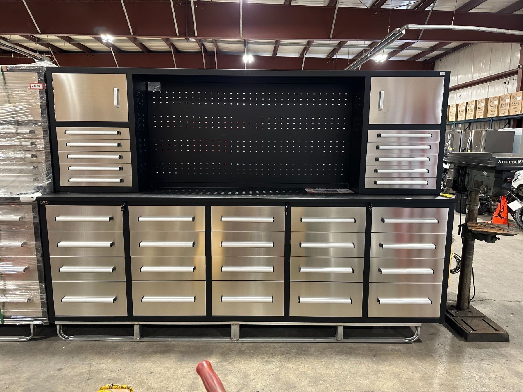 STEELMAN STAINLESS STEEL 30 DRAWER 2 DOOR WORKBENCH 72"H X 112"W X 24"D WITH HUTCH, ANTI-SLIP LINING, LOCKING DRAWERS, KEYS, 3 RAIL SLIDERS WITH 50KG CAPACITY PER DRAWER