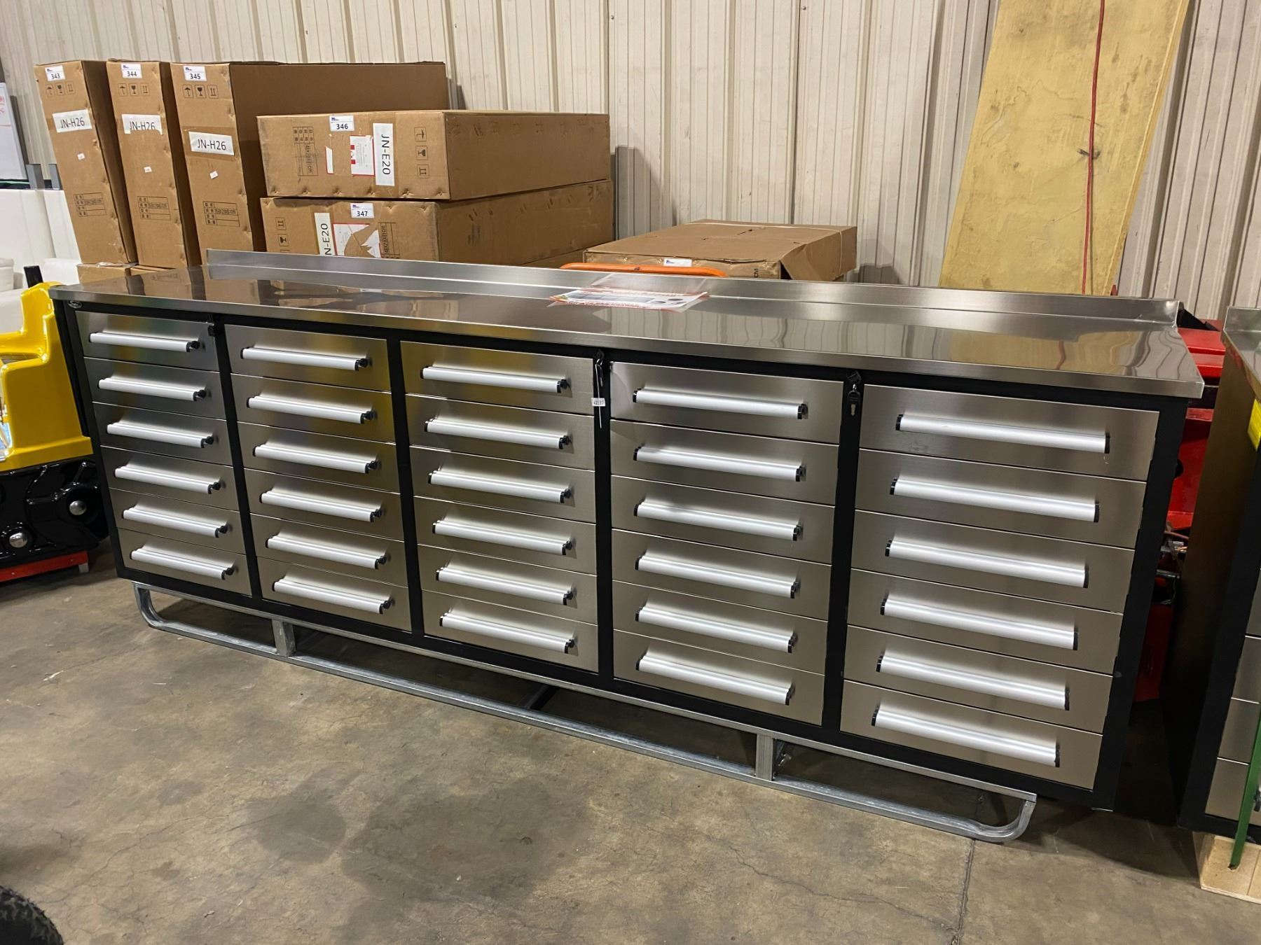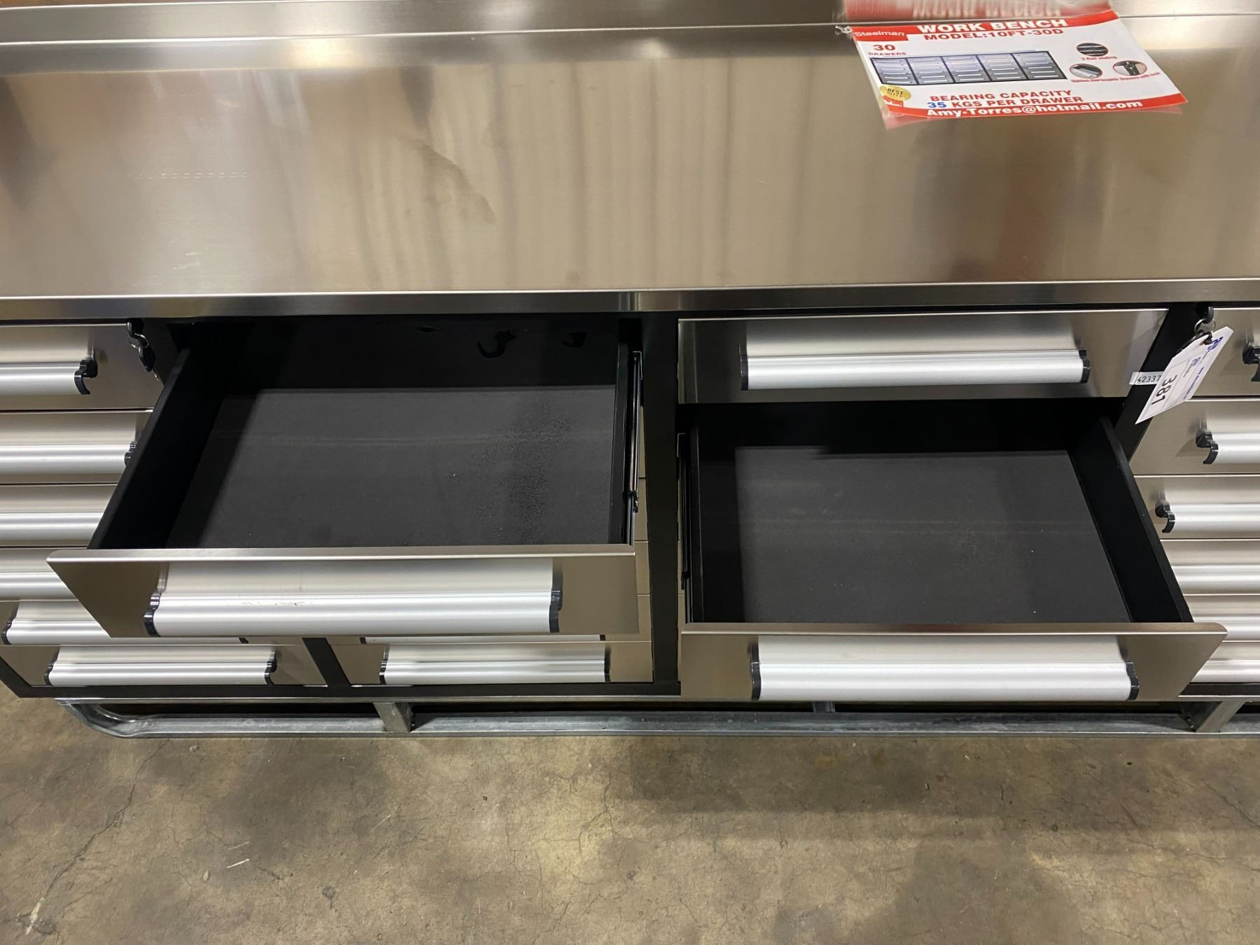 STEELMAN STAINLESS STEEL 30 DRAWER WORKBENCH 36"H X 113"W X 24"D WITH ANTI-SLIP LINING, LOCKING DRAWERS, KEYS, 3 RAIL SLIDERS WITH 35KG CAPACITY PER DRAWER