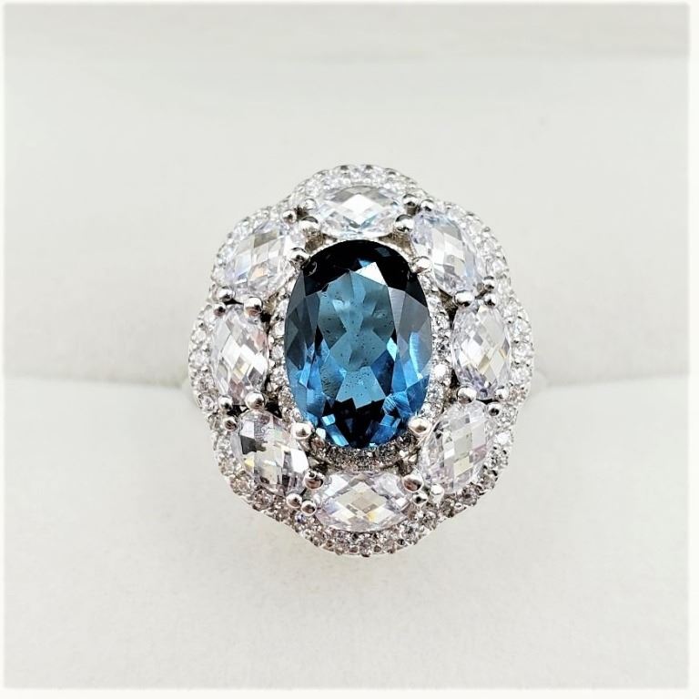 STERLING SILVER 10MM X 6.9MM GENUINE BLUE TOPAZ (2CTS) & CZ RING, W/A $865.00, SIZE 6