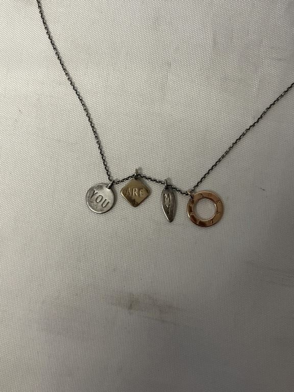STERLING SILVER CHAIN W/ 4 CHARMS, ENGRAVED "YOU ARE MY SUNSHINE" MARKED 925 AND STELLA AND DOT