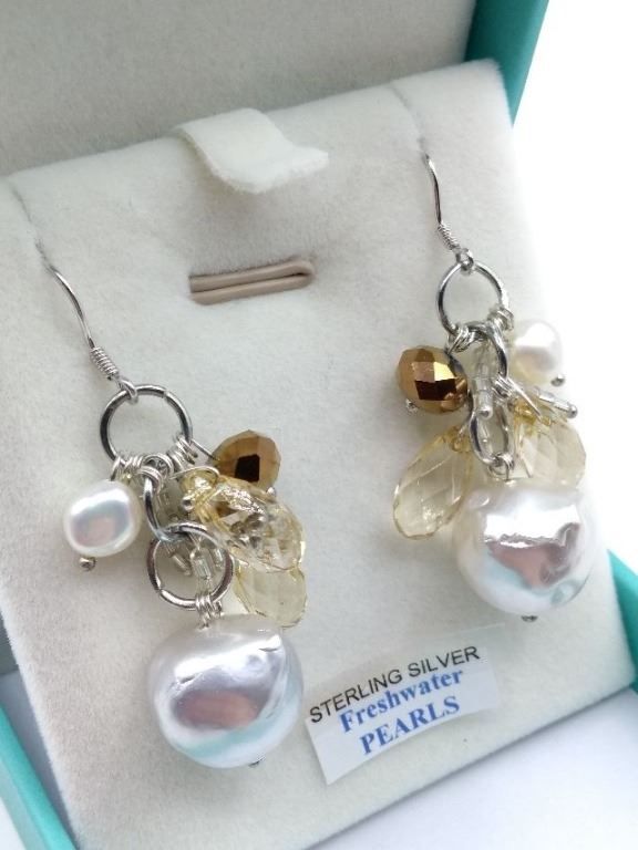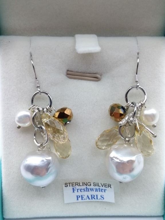 STERLING SILVER DANGLE EARRINGS SET WITH 4 FRESH WATER PEARLS AND ASSORTED CRYSTALS RETAIL $450