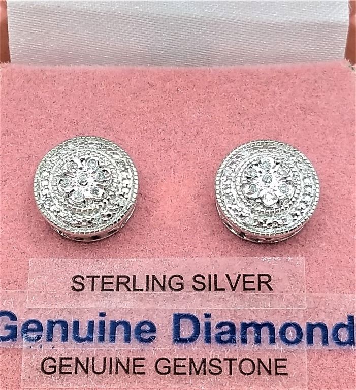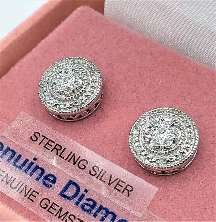 STERLING SILVER DIAMOND EARRINGS W/ APPRIASAL $895 - 15 DIAMONDS (0.01CT) BIRTHSTONE APRIL