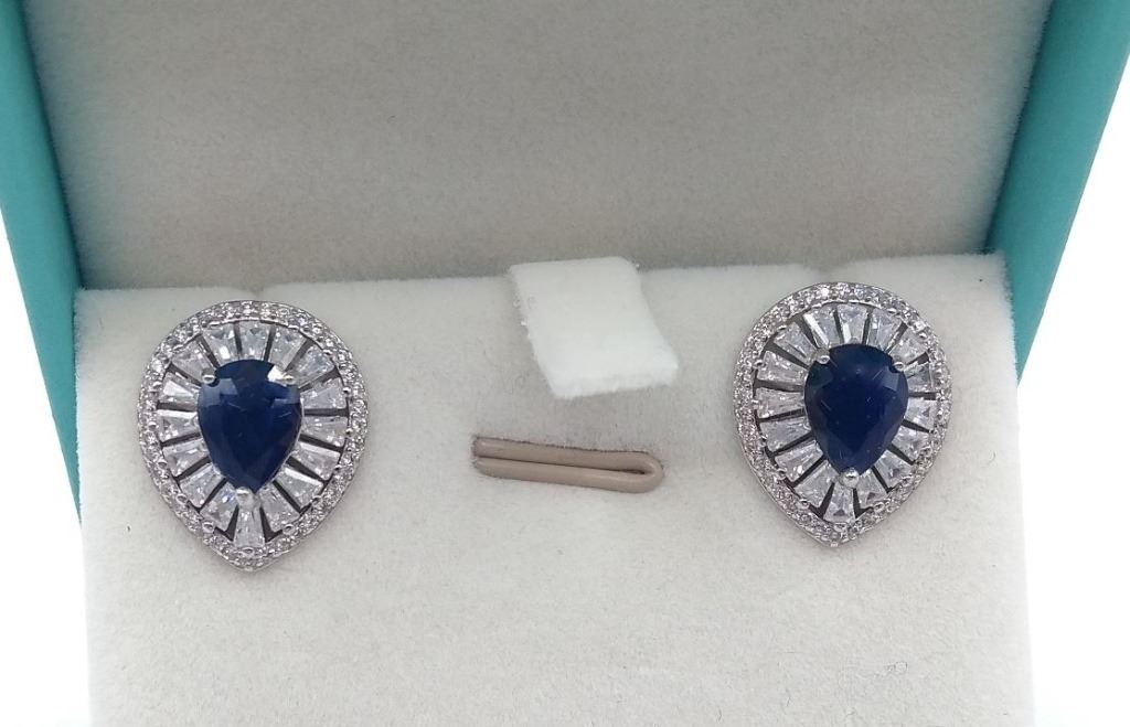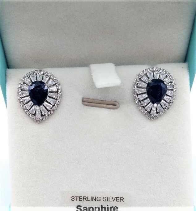 STERLING SILVER EARRINGS SET W/ 2 PEAR SHAPE SAPPHIRE 5.51CTS AND 110 CZ IN FAN STYLE W/ APPRAISAL $1710