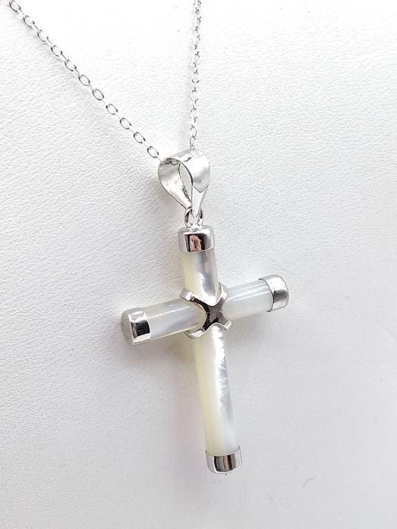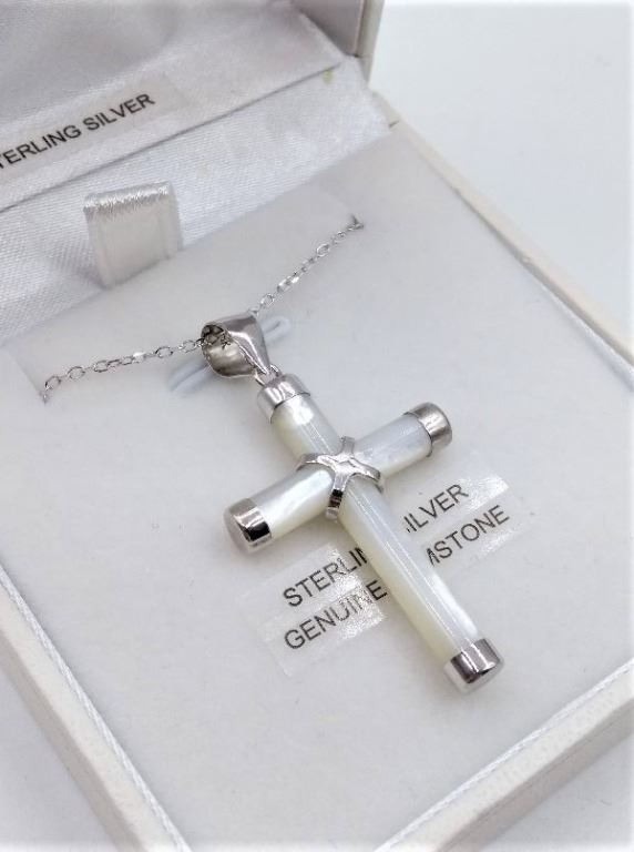 STERLING SILVER MOTHER OF PEARL CROSS W/ STERLING CHAIN W/ APPRAISAL $600