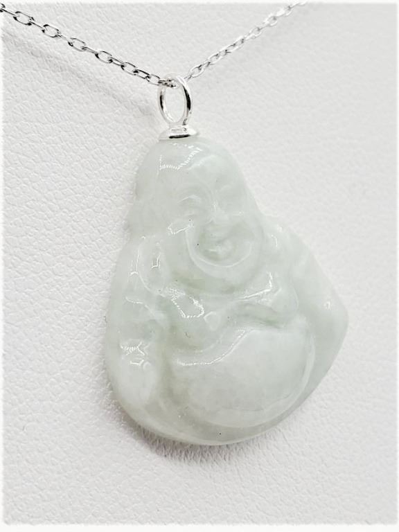 STERLING SILVER NATURAL JADEITE LAUGHING BUDDHA PENDANT WITH STERLING SILVER CHAIN, RETAIL $350.00.