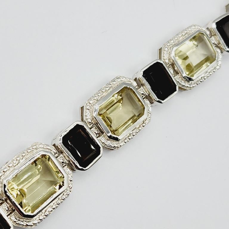 STERLING SILVER NATURAL LEMON QUARTZ (29CT) BRACELET WITH NATURAL SMOKY QUARTZ (15CT), W/A $1575.00. LEMON QUARTZ IS BELIEVED TO FILTER OUT DISTRACTIONS, AID CONCENTRATION AND OPEN MEMORY.