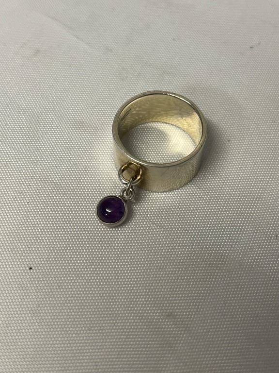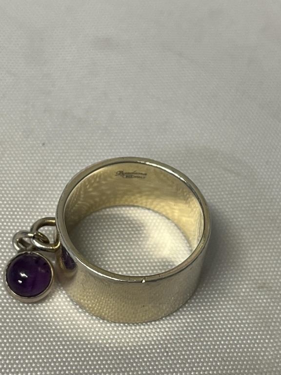STERLING SILVER RING BAND W/ AMETHYST CHARM, MARKED DYADEMA 925 ITALY