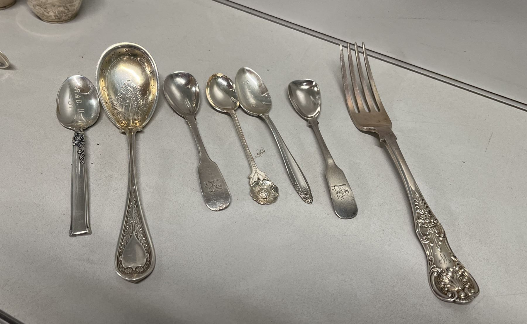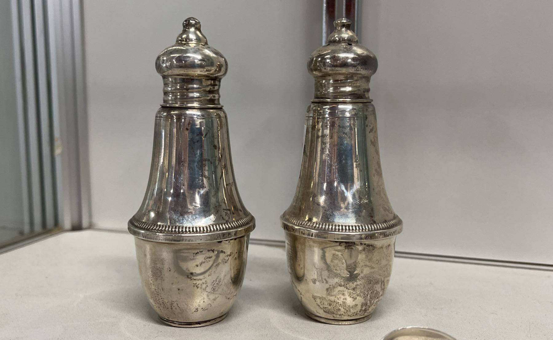 STERLING SILVER SALT & PEPPER SHAKER & SUGAR CUBE TONGS INCLUDES 6 SPOONS & 1 FORK (MOSTLY STERLING SILVER)