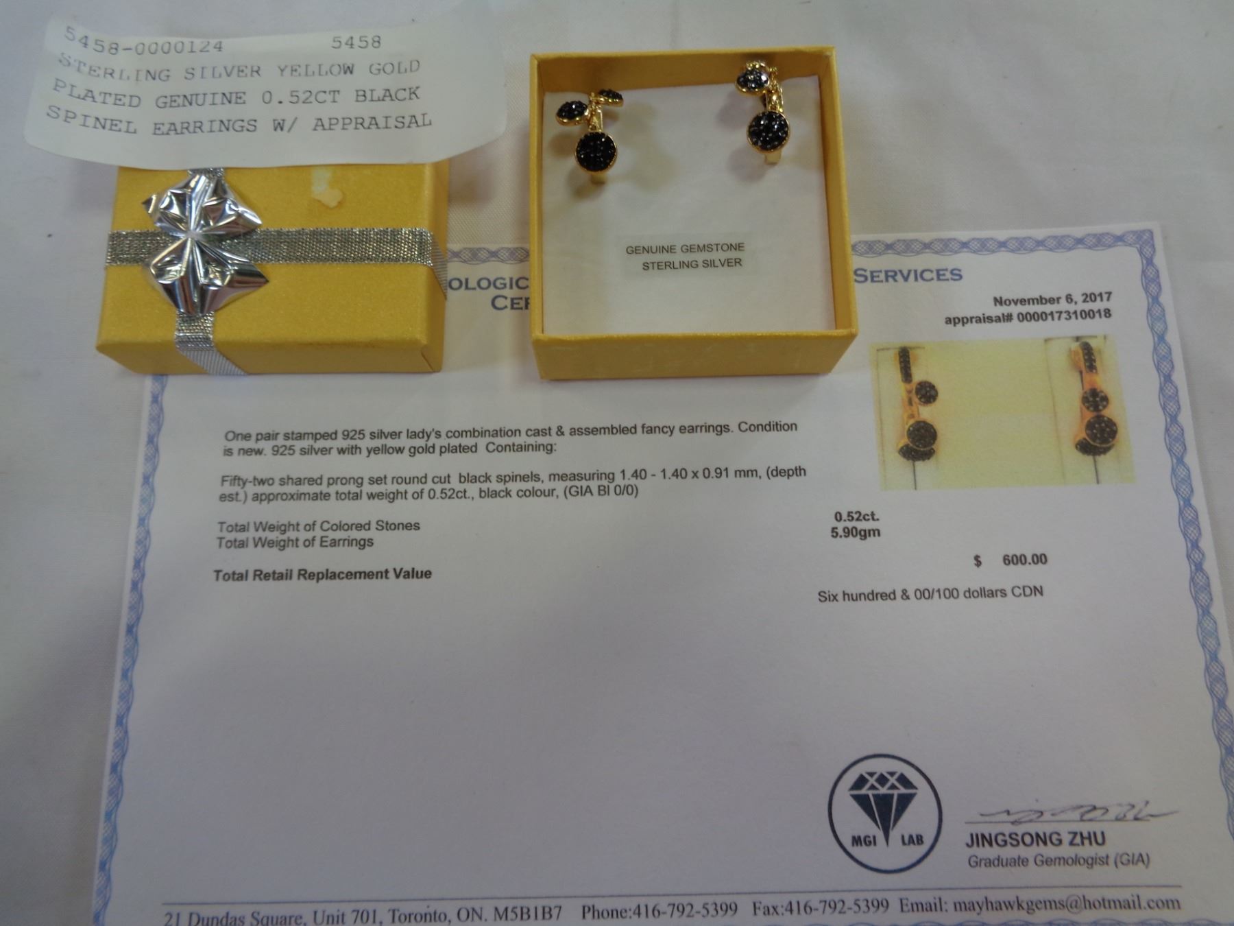 STERLING SILVER YELLOW GOLD PLATED GENUINE 0.52CT BLACK SPINEL EARRINGS W/ APPRAISAL $600