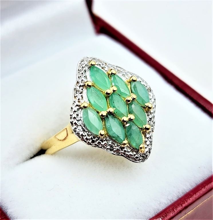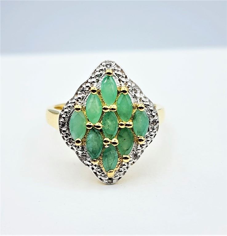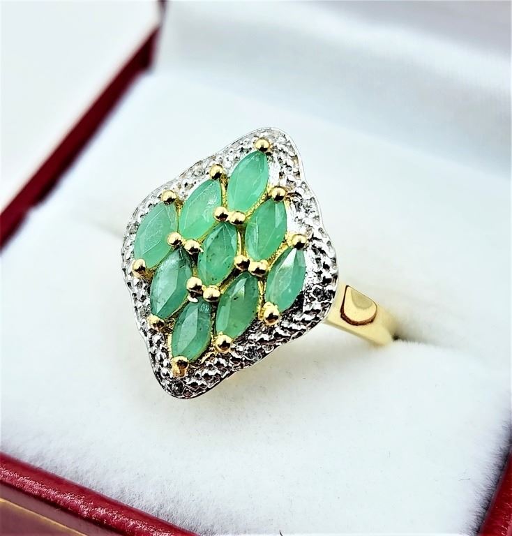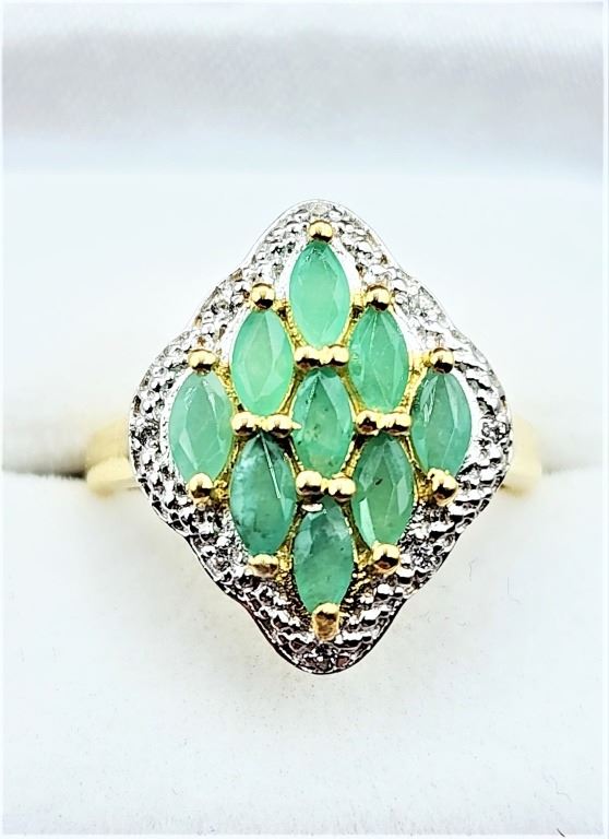STERLING SILVER YELLOW GOLD TONE PLATED NATURAL EMERALD & WHITE SAPPHIRE RING, 9 EMERALD (0.54CTS), W/A $445.00, SIZE 7, EMERALD IS THE BIRTHSTONE FOR MAY