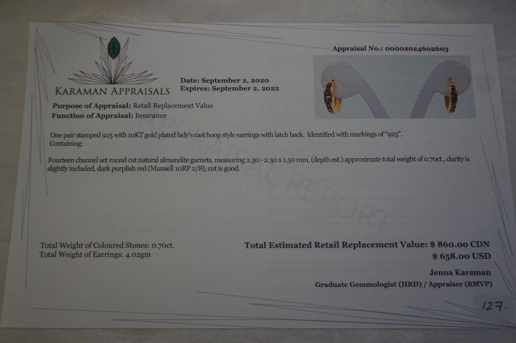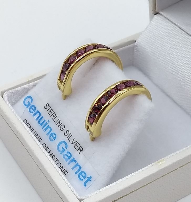 STERLING SIVER YELLOW GOLD PLATED GENUINE GARNET HOOP EARRINGS W/ APPRAISAL $860 - 14 GARNET (.7CTS) BIRTHSTONE JANUARY