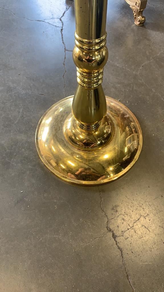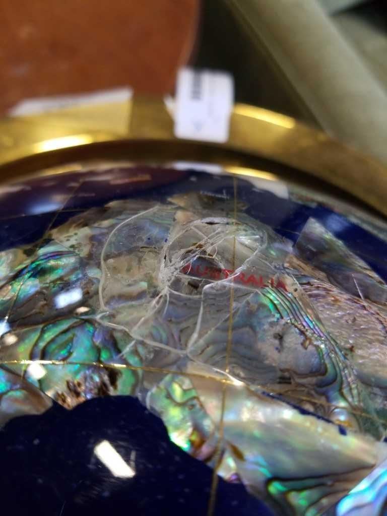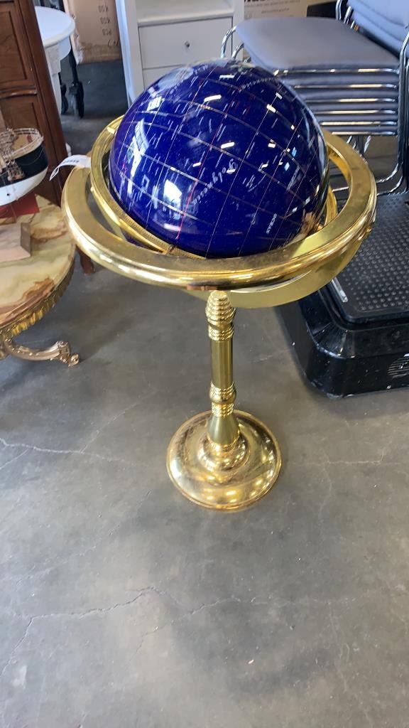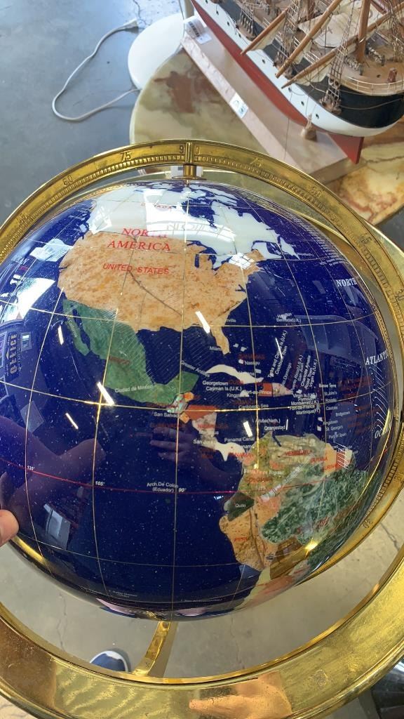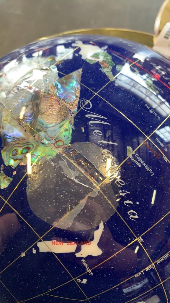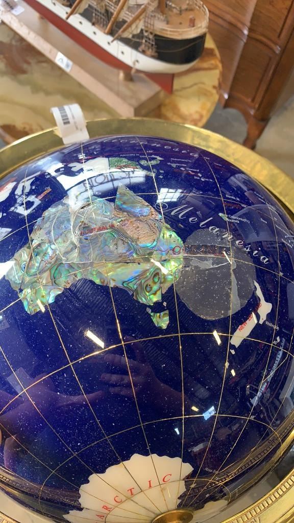 STONE GLOBE ON BRASS STAND - GLOBE CRACKED, INLAY PEELING 38 INCHES TALL