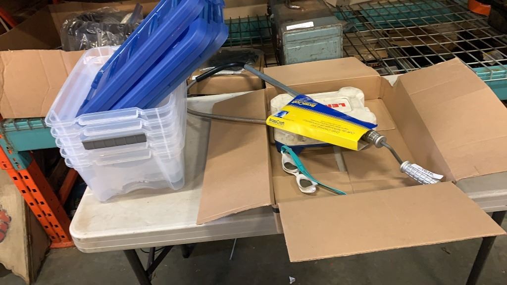 STORAGE BINS WITH LIDS, LENNOX HOLE SAW KIT AND DRAIN CLEANER TOOL
