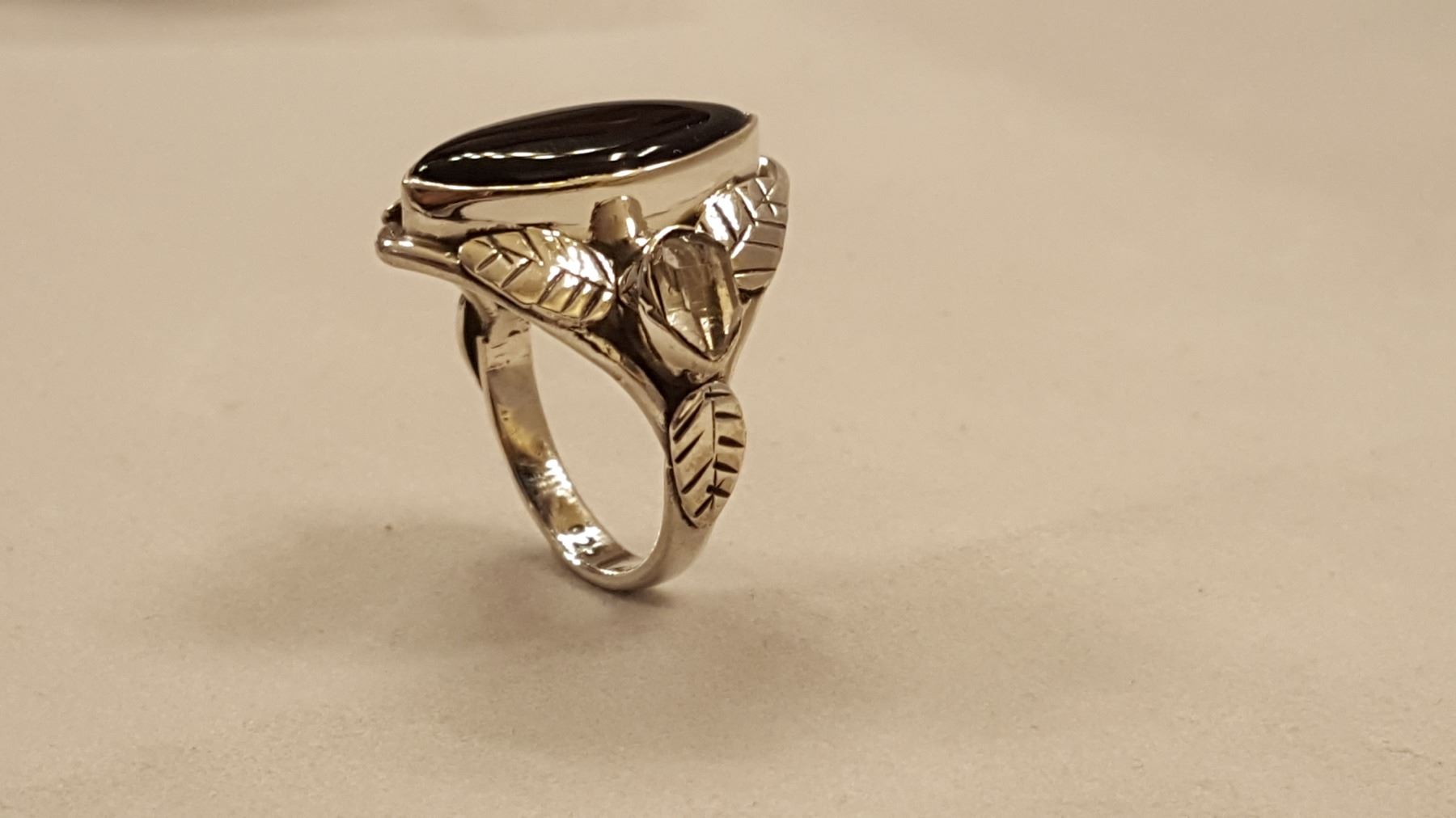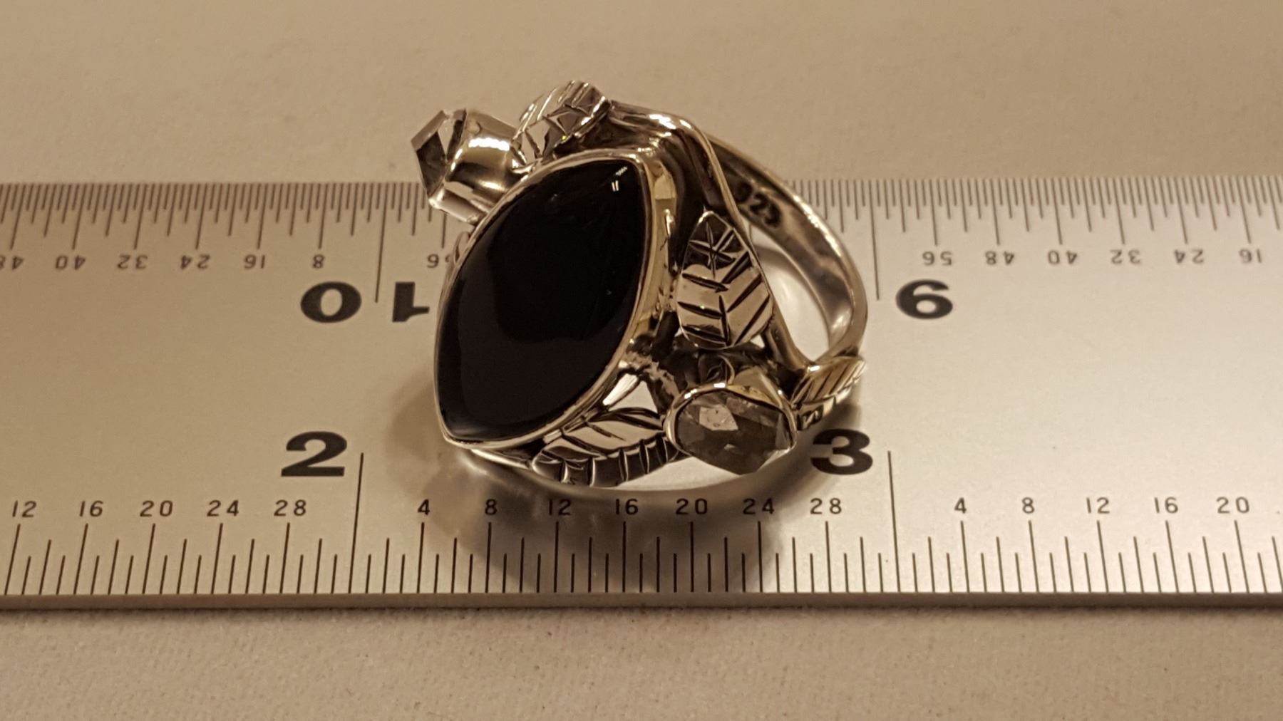 STUNNING BLACK ONYX AND HERKIMER DIAMOND RING. GEM WT APPROX 6 CTS. MOUNTED IN ELABORATELY DESIGNED SOLID STERLING SILVER LEAF SETTING.SIZE 6 1/2. TOTAL GRAM WT 5.9