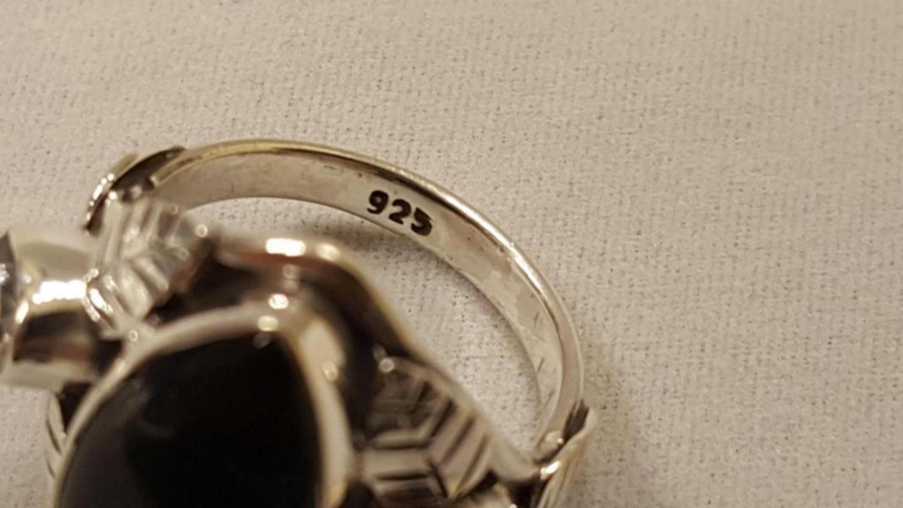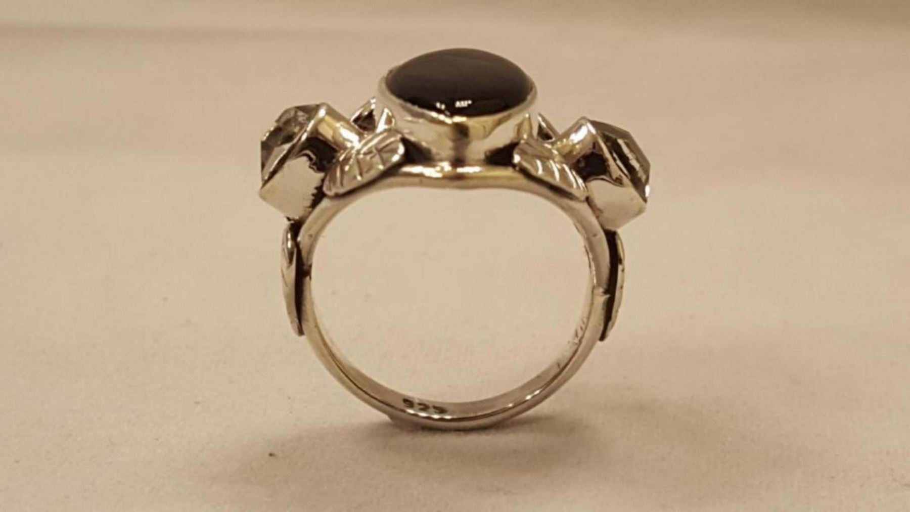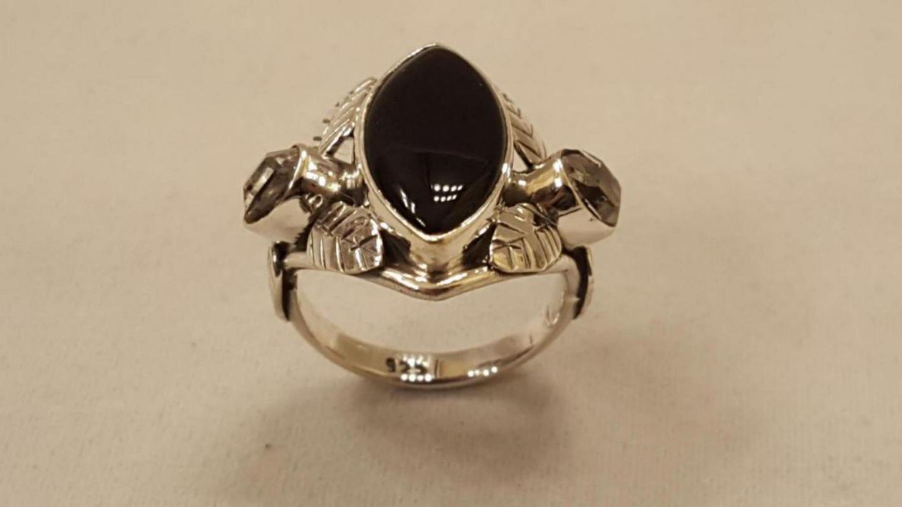 STUNNING BLACK ONYX AND HERKIMER DIAMOND RING. GEM WT APPROX 6 CTS. MOUNTED IN ELABORATELY DESIGNED SOLID STERLING SILVER LEAF SETTING.SIZE 6 1/2. TOTAL GRAM WT 5.9
