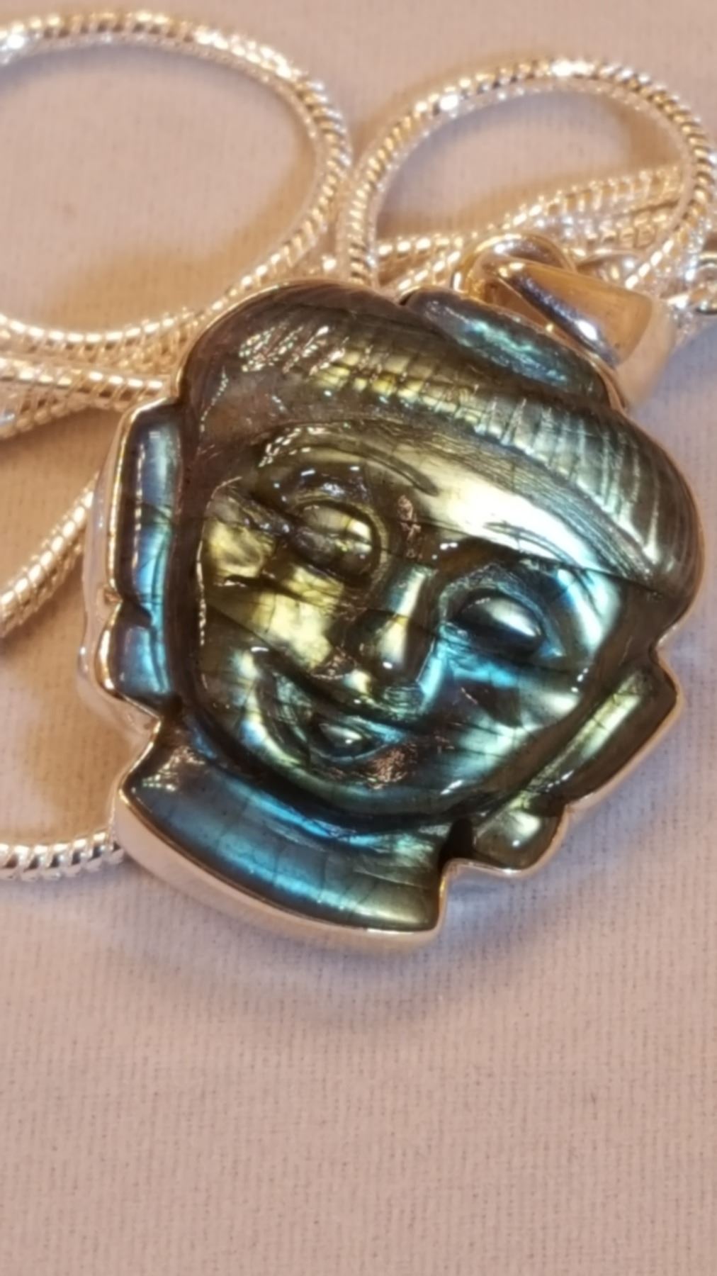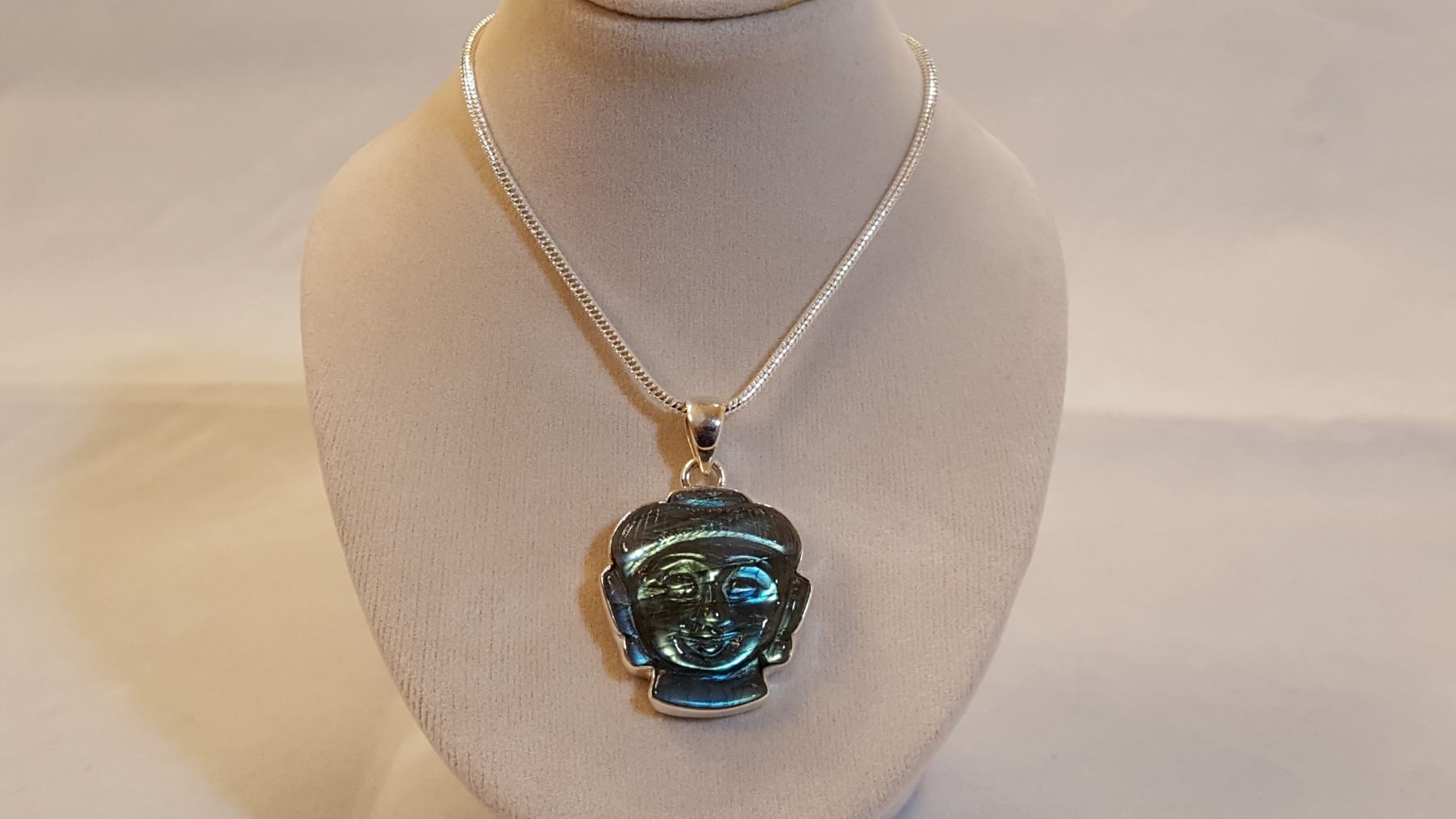 STUNNING RARE HAND CARVED LABRADORITE BUDDAH PENDANT.12.77 CT GEM WT. This Luminicent Labradorite Pendant Is Mounted In Solid .925 Sterling Silver. Includes 20 " Long Chain. 86 Cttw or 17.2 Grams. High. Labradorite is the stone of magical awakening. Experts say that it's vibrations cast a broad level of protection for negative energy. A stone of magic, serendipity and, synchronicity.