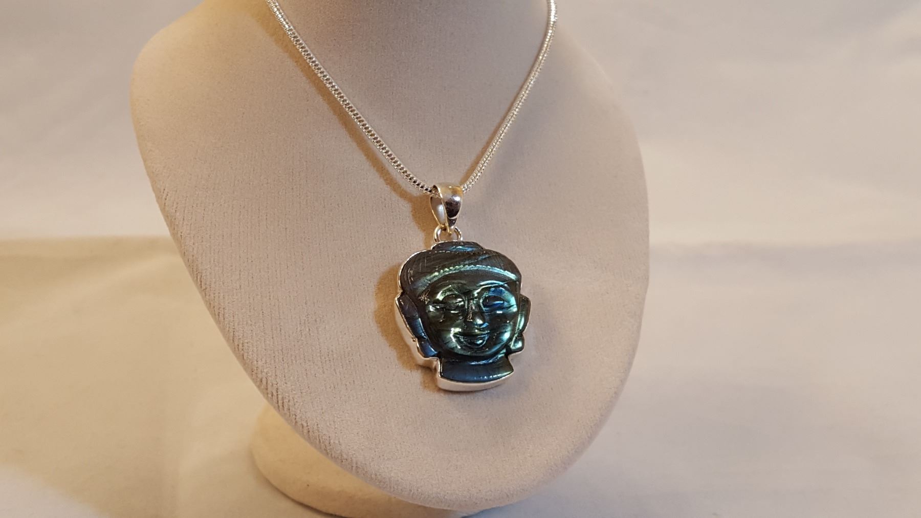 STUNNING RARE HAND CARVED LABRADORITE BUDDAH PENDANT.12.77 CT GEM WT. This Luminicent Labradorite Pendant Is Mounted In Solid .925 Sterling Silver. Includes 20 " Long Chain. 86 Cttw or 17.2 Grams. High. Labradorite is the stone of magical awakening. Experts say that it's vibrations cast a broad level of protection for negative energy. A stone of magic, serendipity and, synchronicity.
