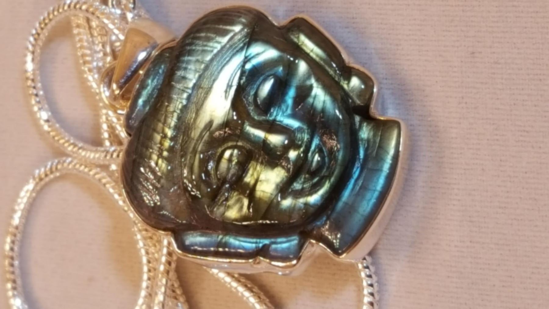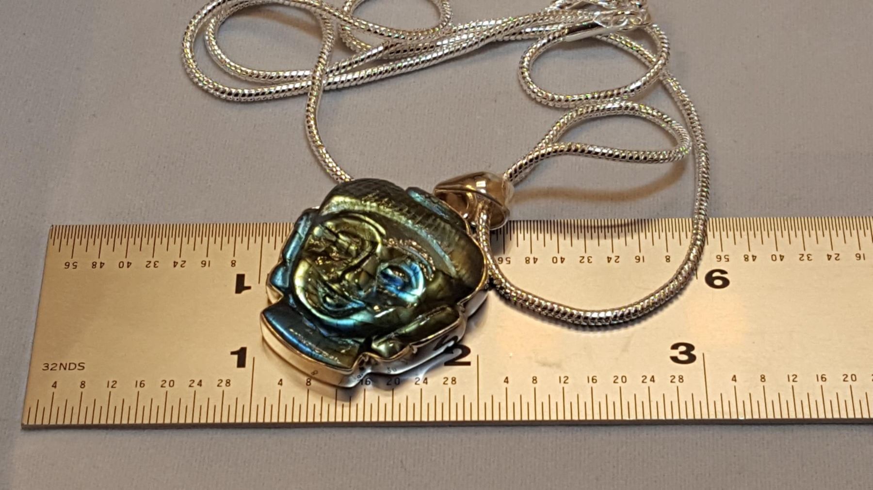 STUNNING RARE HAND CARVED LABRADORITE BUDDAH PENDANT.12.77 CT GEM WT. This Luminicent Labradorite Pendant Is Mounted In Solid .925 Sterling Silver. Includes 20 " Long Chain. 86 Cttw or 17.2 Grams. High. Labradorite is the stone of magical awakening. Experts say that it's vibrations cast a broad level of protection for negative energy. A stone of magic, serendipity and, synchronicity.