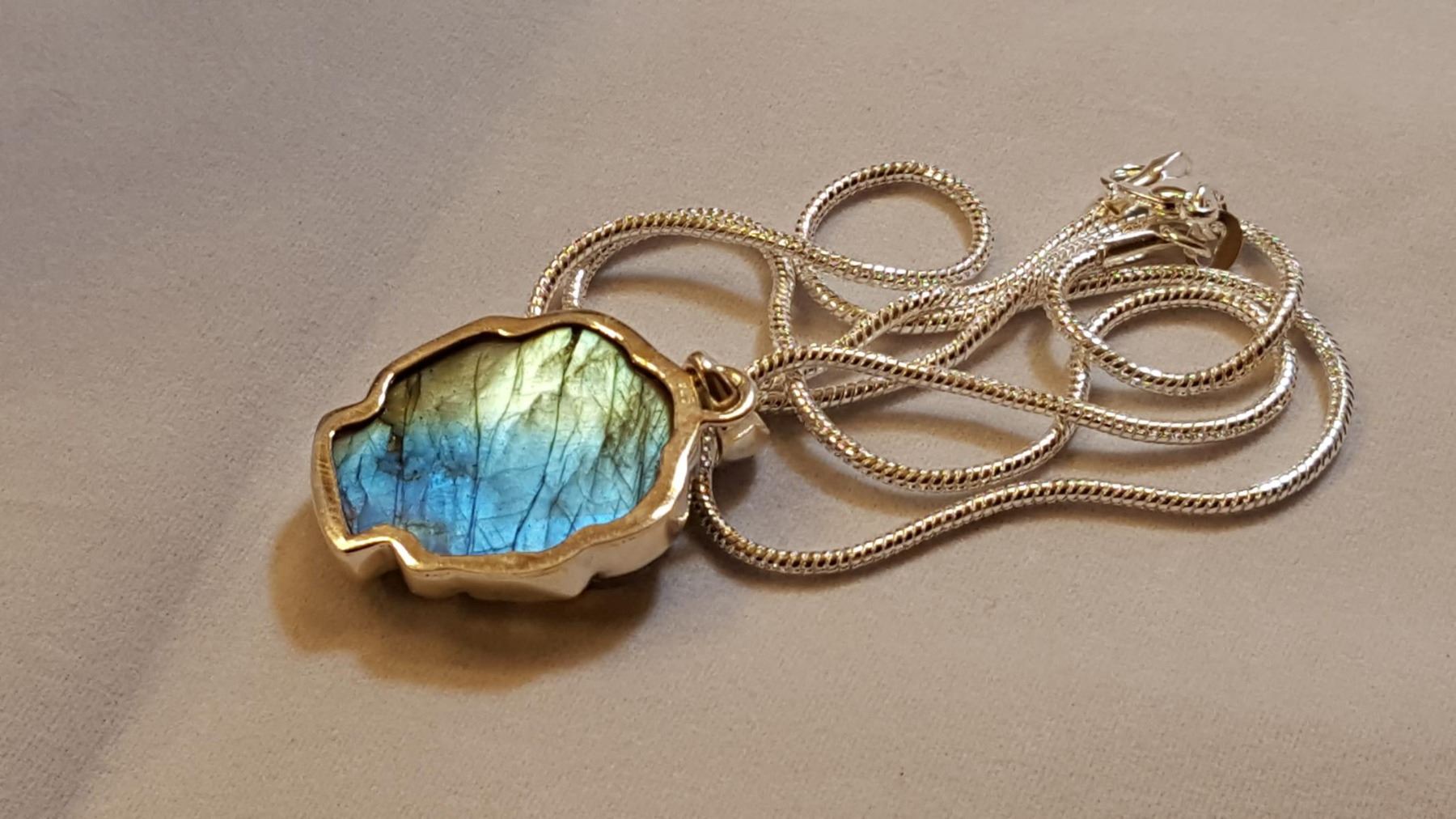 STUNNING RARE HAND CARVED LABRADORITE BUDDAH PENDANT.12.77 CT GEM WT. This Luminicent Labradorite Pendant Is Mounted In Solid .925 Sterling Silver. Includes 20 " Long Chain. 86 Cttw or 17.2 Grams. High. Labradorite is the stone of magical awakening. Experts say that it's vibrations cast a broad level of protection for negative energy. A stone of magic, serendipity and, synchronicity.