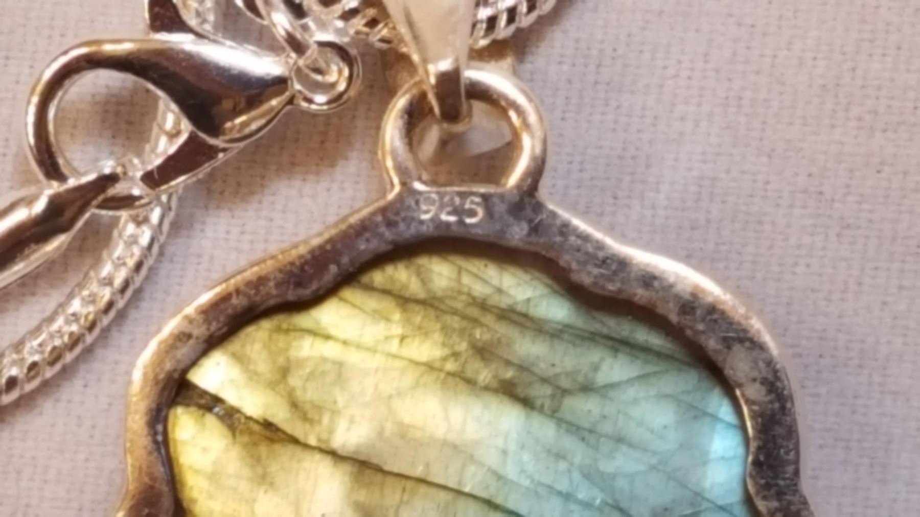 STUNNING RARE HAND CARVED LABRADORITE BUDDAH PENDANT.12.77 CT GEM WT. This Luminicent Labradorite Pendant Is Mounted In Solid .925 Sterling Silver. Includes 20 " Long Chain. 86 Cttw or 17.2 Grams. High. Labradorite is the stone of magical awakening. Experts say that it's vibrations cast a broad level of protection for negative energy. A stone of magic, serendipity and, synchronicity.