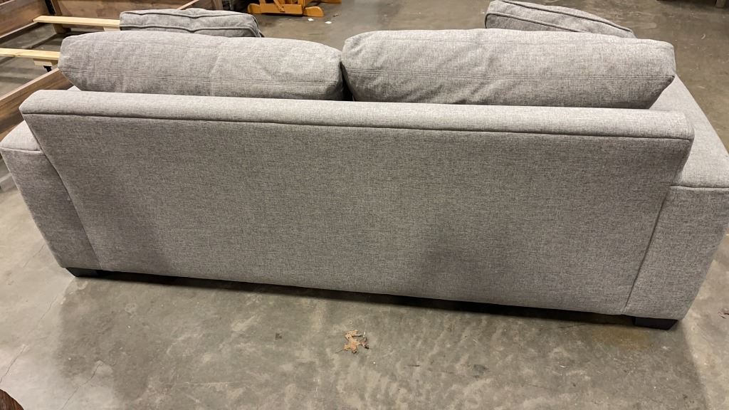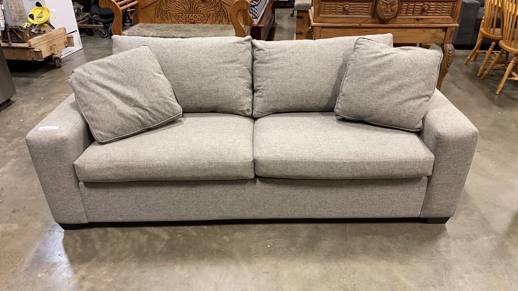 STYLUS "CANNON" QUEEN SIZE SOFA BED - CANADIAN MADE, SOLID WOOD FRAME, FEATHER DOWN SEAT AND BACK W/ 2 THROW PILLOWS, DELUX MEMORY FOAM MATTRESS, EXCELLENT CONDITION, 36"H X 39"D X 87"W