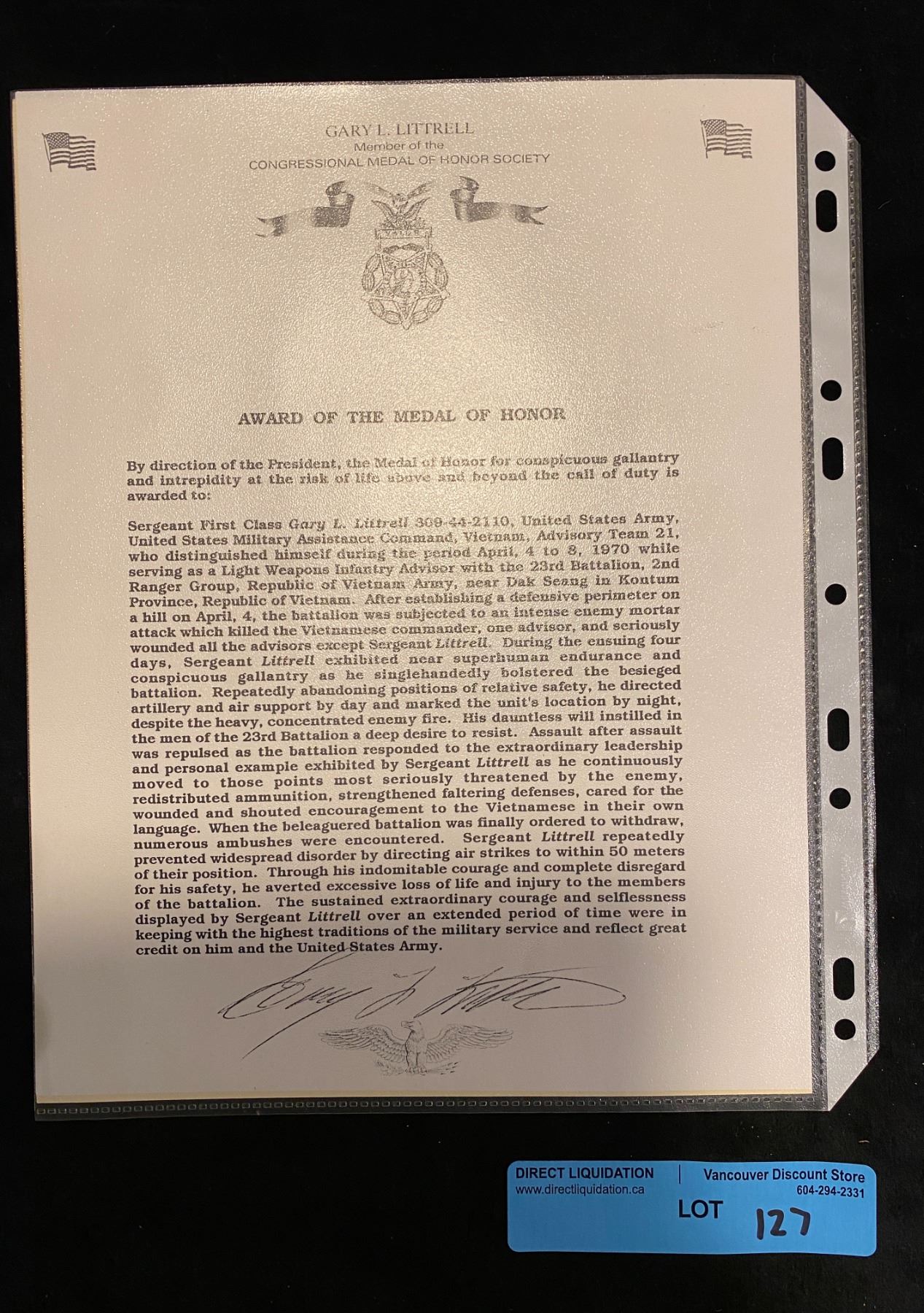 Saigon Original Metal of honour Signature and history of Saigon Recipient CWO- SGT. Gary Lee Litterell
