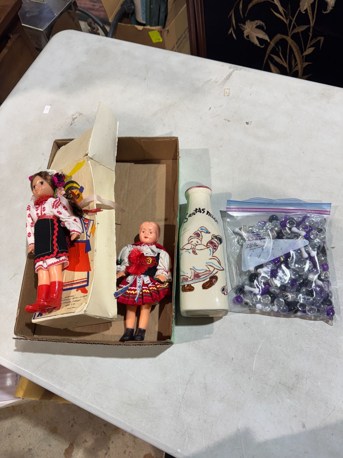 Santa's ?? milk, jar, assorted decor, rocks, and dolls