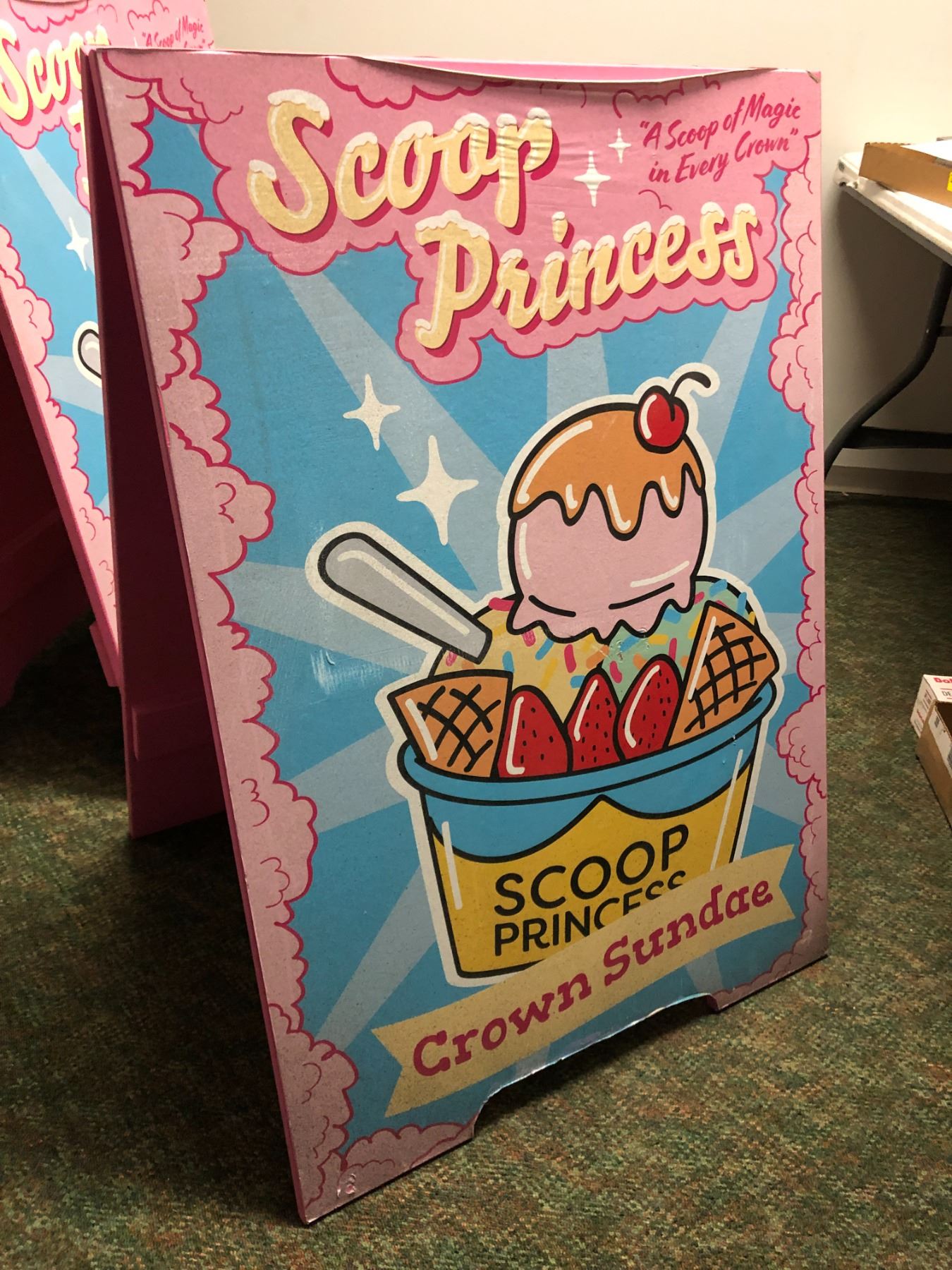 "Scoop Princess" sandwich board advertisement sign from the Blockbuster partial animated movie - approx. 30in tall x 26 1/2in wide