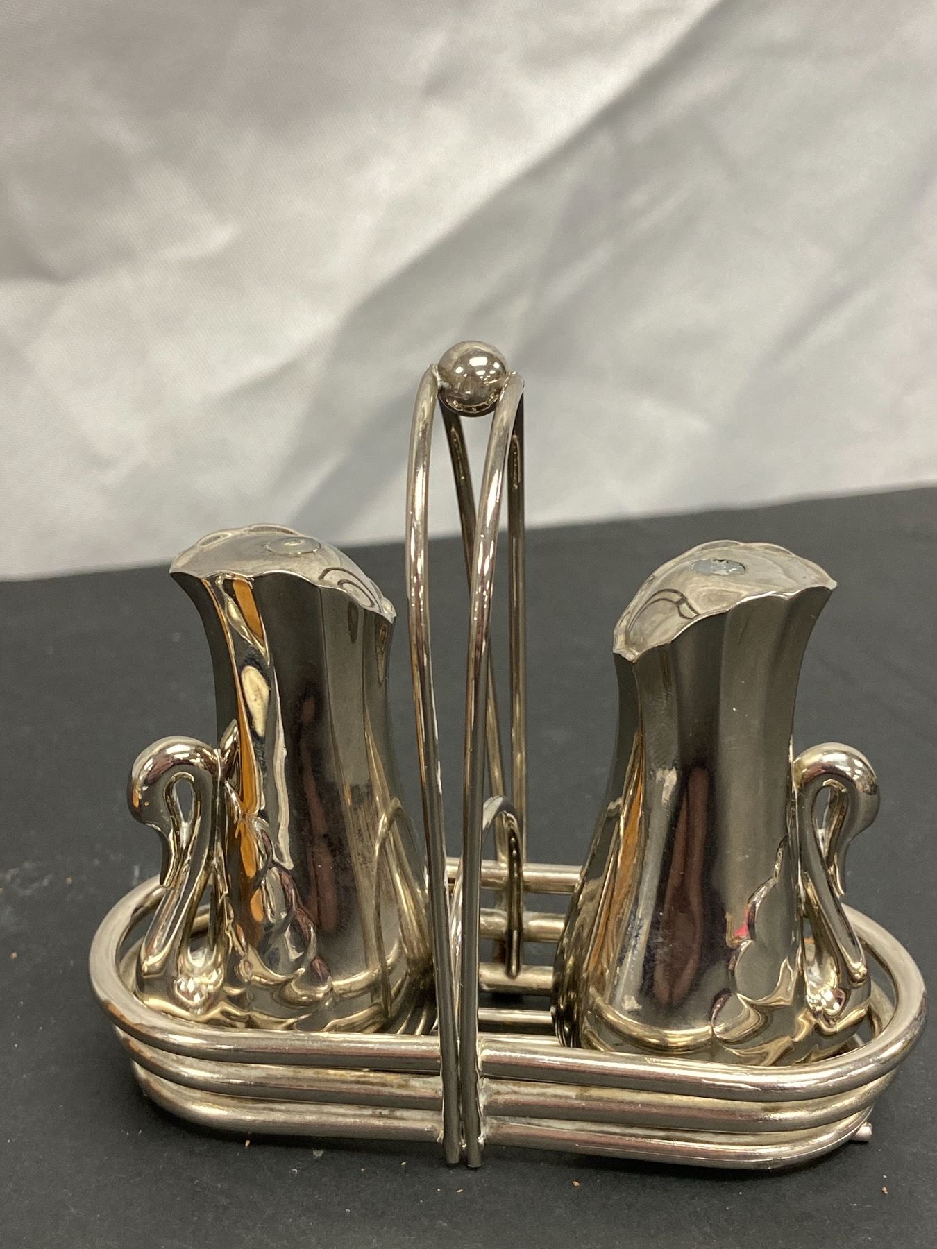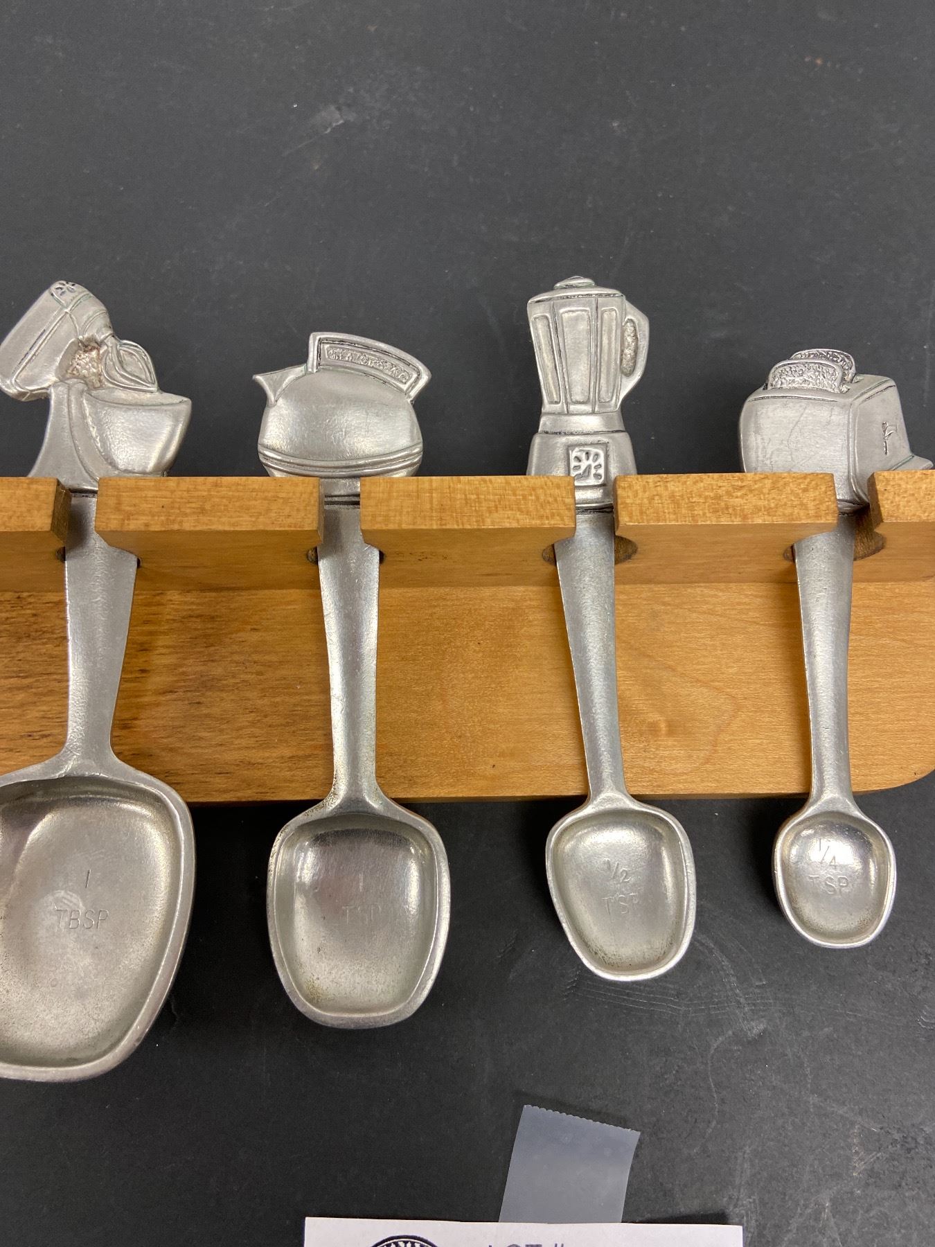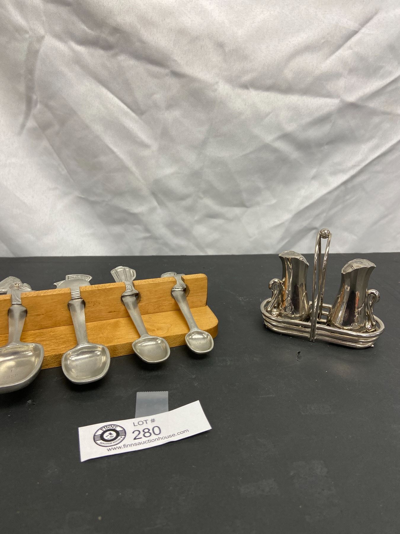Seagull Pewter Canada Measuring Spoons with Display Rack and Silver Plated Salt & Pepper Shakers in Caddy with Handle